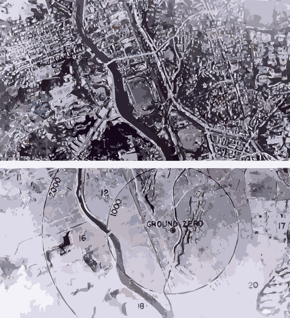 This is a black and white photo of a city with a river running through it. There are several buildings visible in the scene, some closer to the water's edge while others are situated further away. A large circle can be seen on the right side of the image, possibly indicating an important landmark or point of interest within the city. The overall atmosphere of the photo suggests a historical or vintage feel, as it captures the urban landscape from a different time period.