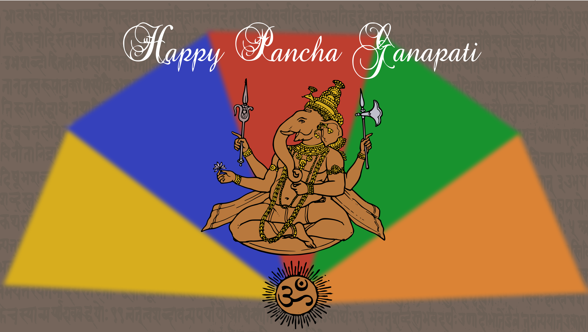 This features a colorful display of a Hindu deity, possibly Lord Ganesha, sitting on top of a yellow, green, blue, and red background. The deity is surrounded by various symbols and decorations, including a sun in the middle of the scene. The overall atmosphere suggests a celebration or festival, likely related to Pancha Ganapati, which is a modern five-day Hindu event celebrated from December 21 through December 25 in honor of Lord Ganesha. This festival was created relatively recently in 1985 as an alternative to traditional South Asian holidays like Christmas and has gained popularity among Hindus living outside their native countries, particularly in North America.