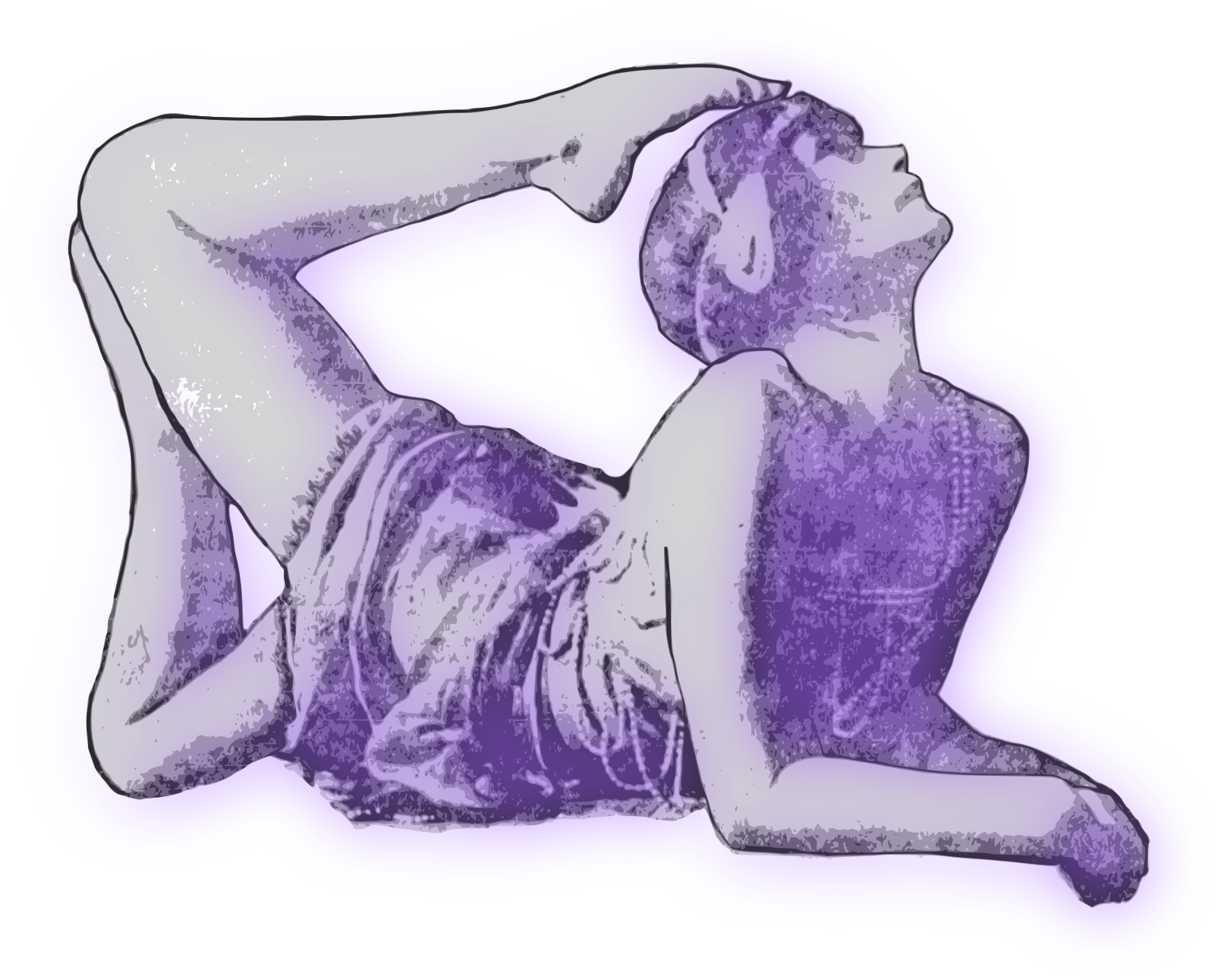 This features a woman in an artistic pose, lying on her side with one leg up and the other foot resting on her head. She appears to be twisting herself into an unconventional position, showcasing her flexibility. The woman's body is adorned with a purple dress that adds a touch of color to the scene. The overall composition of the image gives off a sense of creativity and artistic expression.