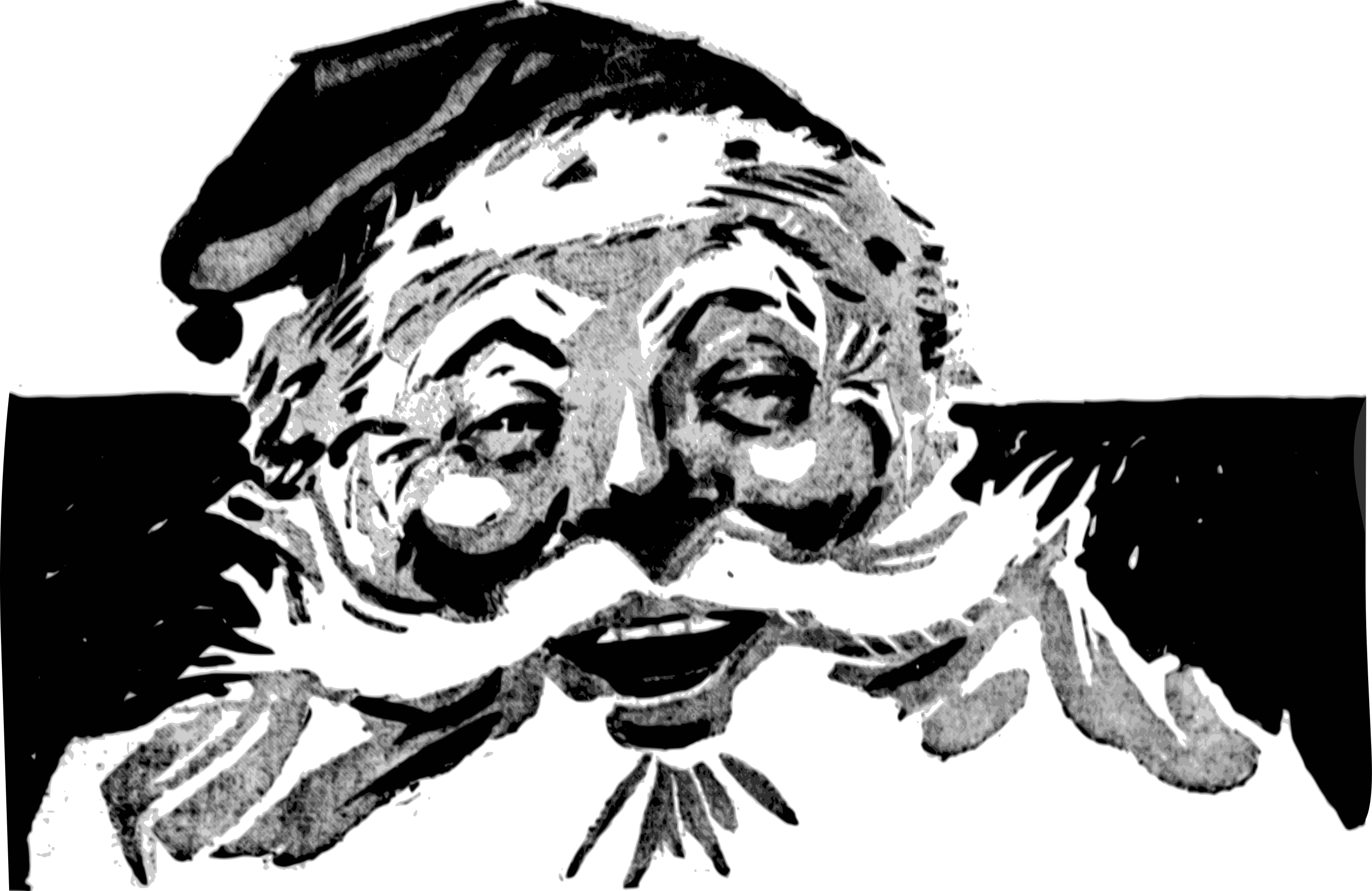 This features a black and white drawing of Santa Claus, with his mouth wide open as if he is yawning. He has a beard and mustache, giving him the appearance of an old man. The drawing captures the essence of the jolly old Santa that many people associate with Christmas time. It's interesting to note that Santa is often depicted as an older gentleman, but there are no images or descriptions of what he might have looked like when he was younger. However, it can be assumed that he would have had a similar appearance to other men during his youth. The drawing evokes the festive spirit and joy associated with the holiday season.