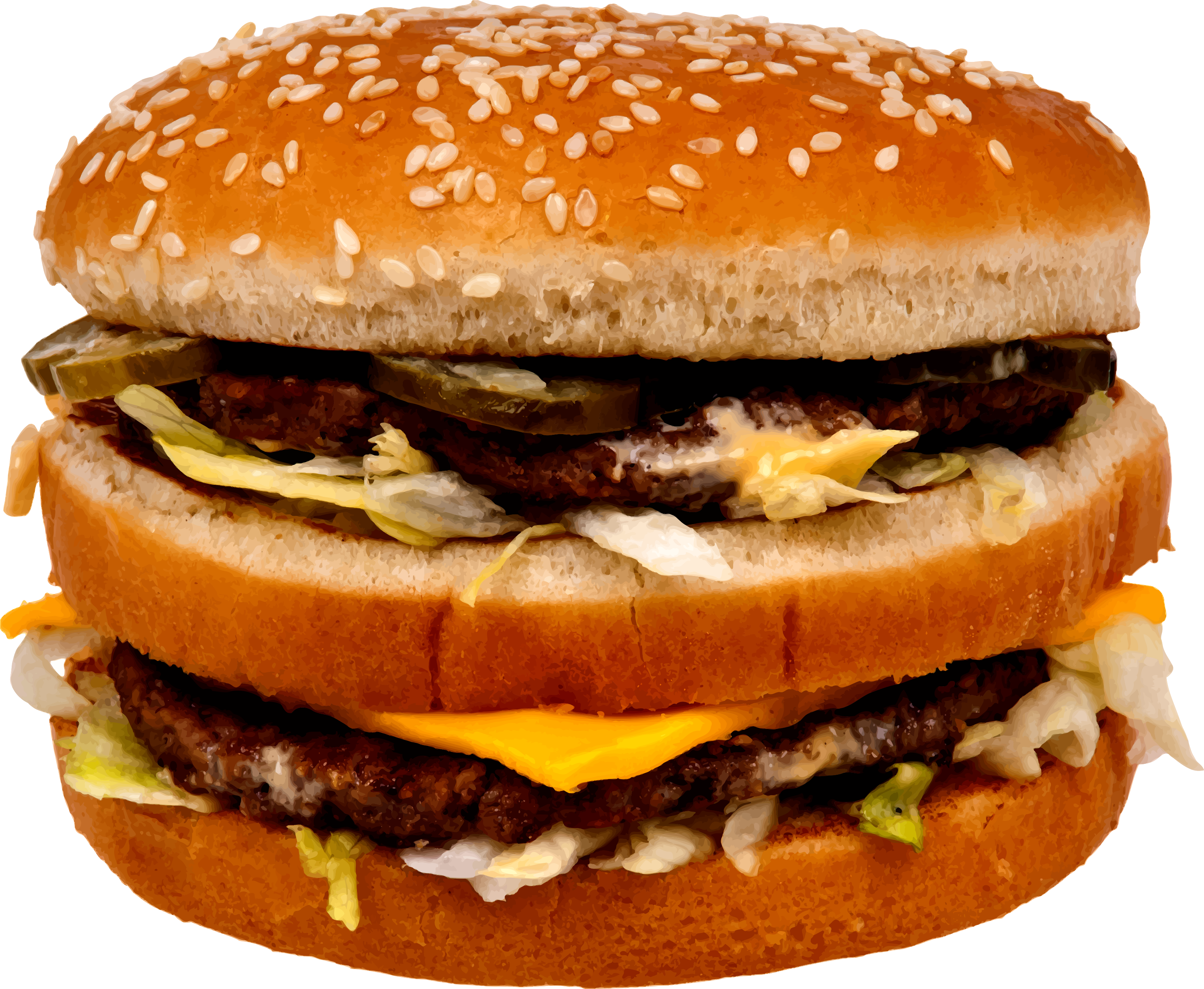 This features a large, double stacked cheeseburger with lettuce and tomato on top. It is a close-up view of the sandwich, showcasing its delicious ingredients. The burger appears to be a McDonald's Big Mac, which is known for its signature sauce and generous portioning. This type of sandwich is popular among fast food lovers and those who enjoy indulging in a hearty meal.