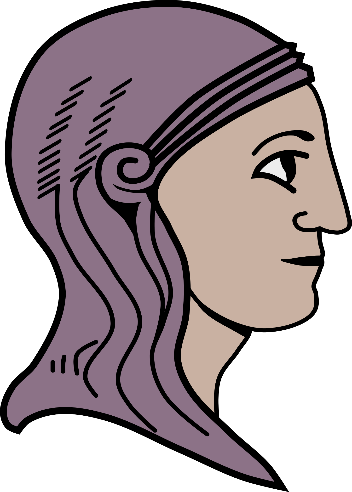 This features a woman with long, curly hair and a purple headband. She is wearing a purple dress and has a nose that appears to be quite large. Her eyes are open wide as she looks directly at the viewer. This drawing could potentially represent a female figure from ancient times or a modern-day interpretation of an old symbol. The woman's attire, including her headband and dress, gives off a sense of elegance and grace.