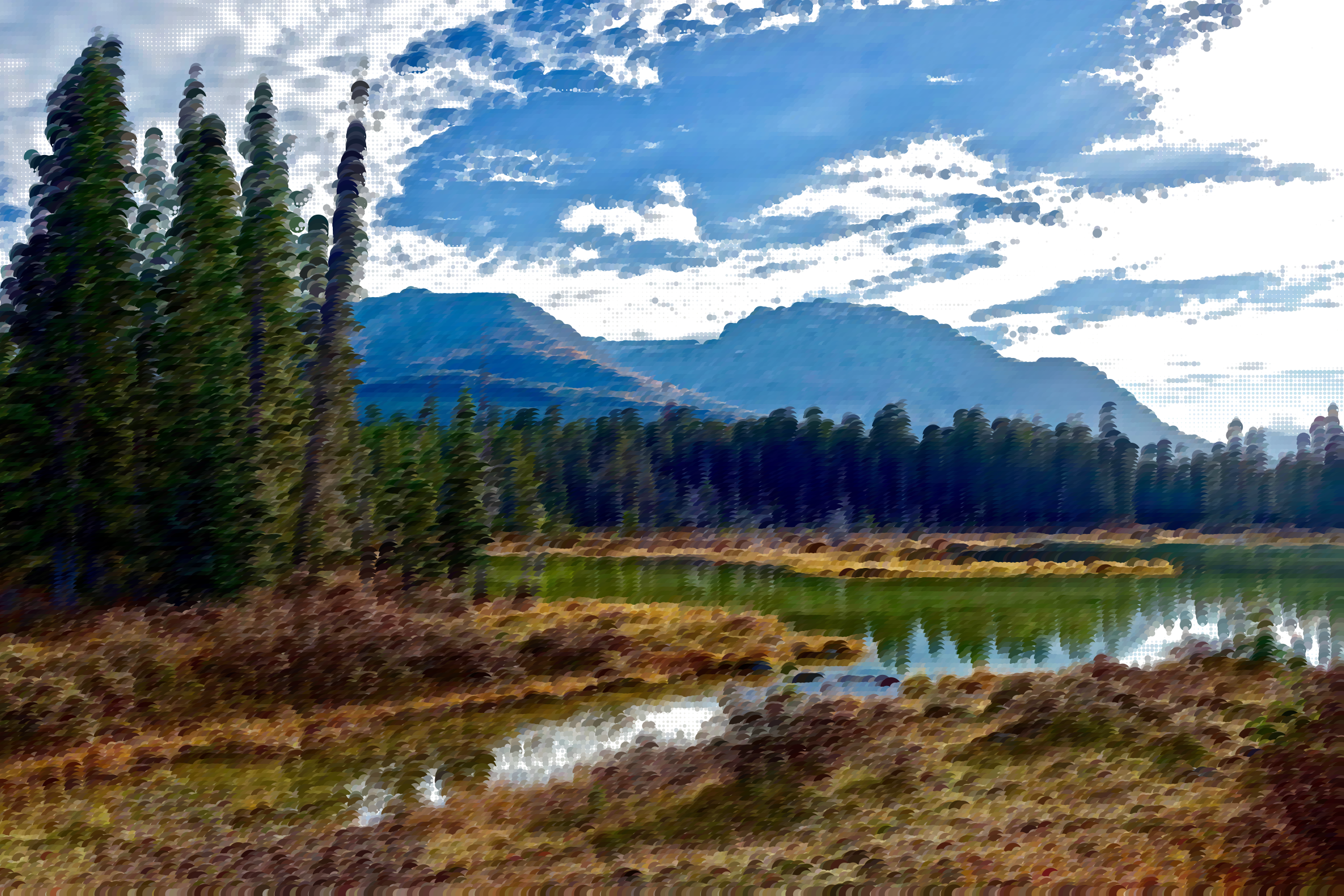 This features a serene scene of a lake surrounded by trees and mountains. There are several pine trees in the foreground, with some closer to the water's edge and others further away. A few more trees can be seen in the background, adding to the natural beauty of the landscape. The lake is calm and reflective, creating a peaceful atmosphere. In addition to the trees, there are two birds flying above the water, adding life to the scene. Overall, it's an idyllic representation of nature with a picturesque view of mountains in the distance.