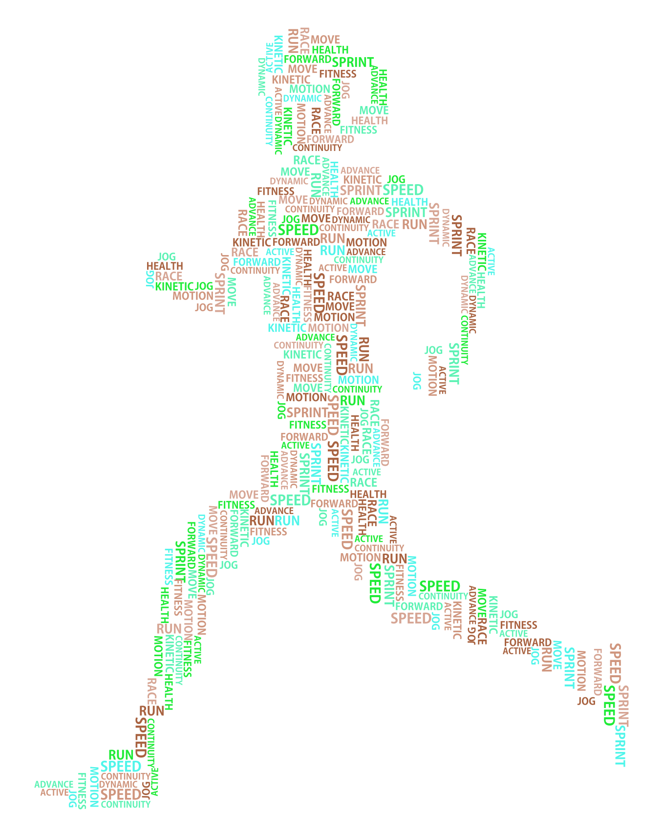 This features a word cloud of various words related to running. These words are arranged in such a way that they form the shape of a person, with some words being larger and more prominent than others. The word cloud is predominantly green and red, creating an eye-catching visual effect. The arrangement of these words creates a sense of motion, as if the person is actively running through the scene. This creative representation of running-related terms adds a unique touch to the image.