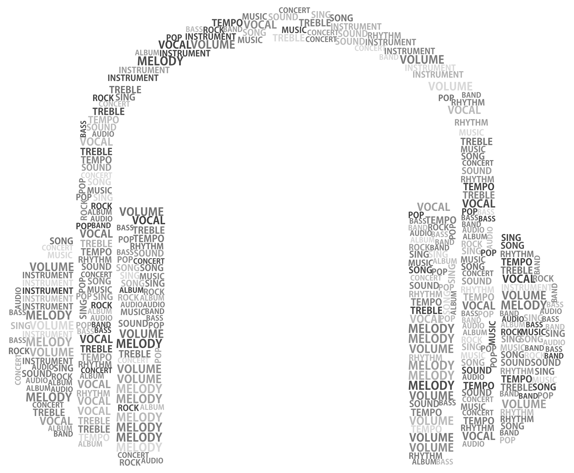 This is a word cloud of various words related to music and headphones. The words are arranged in such a way that they form the shape of a pair of headphones, with some words overlapping each other. The word "volume" can be seen at the top left corner of the image, while "melody" is located towards the bottom right side. Other words like "songs", "tunes", and "beats" are also present in the cloud, adding to the overall theme of music and headphones. The word cloud creates a visually appealing representation of these related terms, making it an interesting visual for anyone interested in music or technology.
