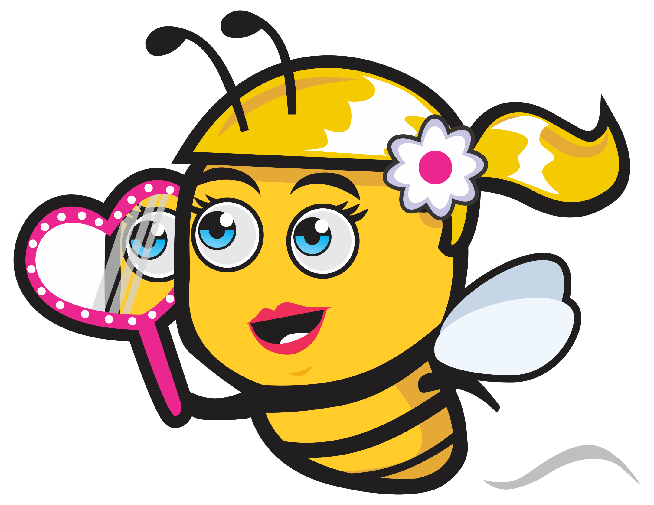 This features a cartoon bee with a pink heart-shaped mirror in its hand. The bee is wearing a yellow and white dress, and it appears to be looking at itself in the mirror. It has a flower on its head, adding a touch of whimsy to the scene. The overall atmosphere of the image is playful and lighthearted, with the bee seemingly enjoying its time spent admiring itself in the mirror.