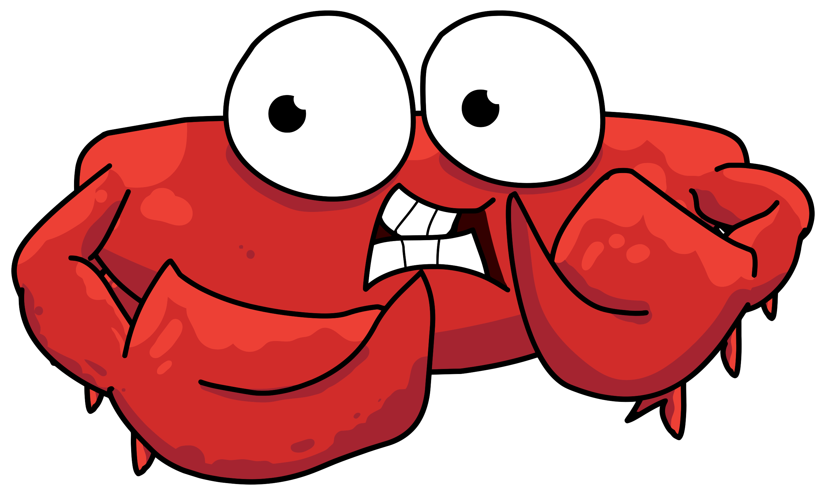 This features a cartoon crab with big eyes and an open mouth, making it appear as if it is yawning. It has red claws and legs, giving it a vibrant appearance. The crab's facial expression suggests that it might be feeling sleepy or tired. This whimsical illustration could be used for various purposes such as children's books, educational materials, or even as an animated character in a cartoon show.
