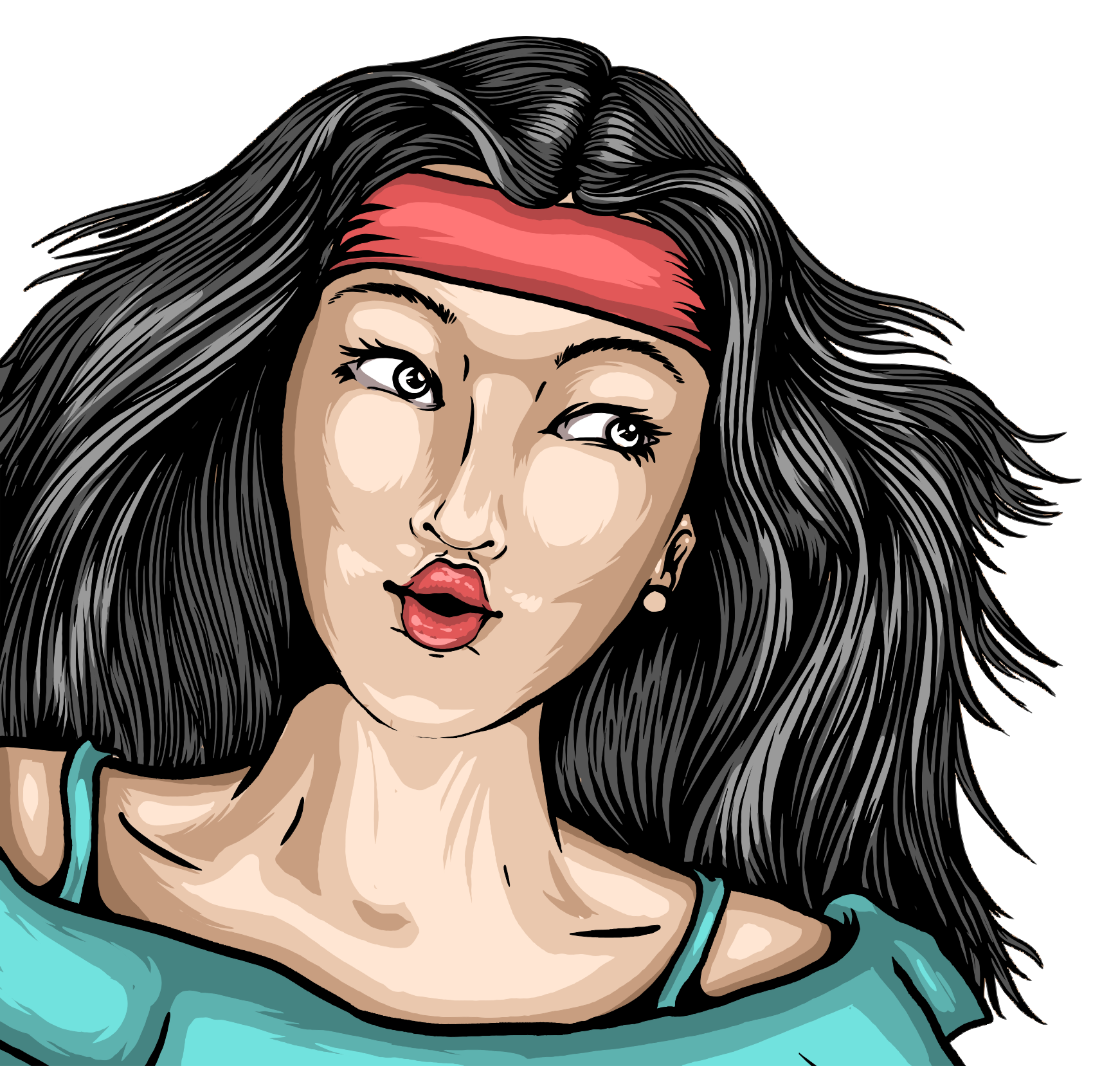 This features a woman with long, dark hair and a red headband. She is wearing earrings and has her mouth open as if she's singing or making a funny face. Her eyes are wide open, giving the impression that she might be surprised or excited about something. The drawing of this woman appears to be done in a colorful style, with various shades of blue and red used throughout the image.