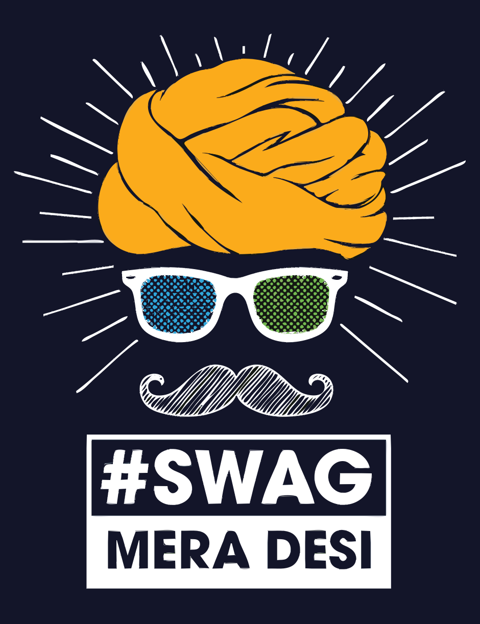 This features a poster for the song "Swag Mera Desi," which is written in white letters on a dark blue background. Above the text, there is an illustration of a man wearing sunglasses and a mustache, with a yellow turban wrapped around his head. This unique design gives the impression that the poster is promoting a hipster-style song or brand. The combination of the colorful turban, glasses, and mustache creates a visually appealing and eye-catching image that captures attention and adds character to the poster.