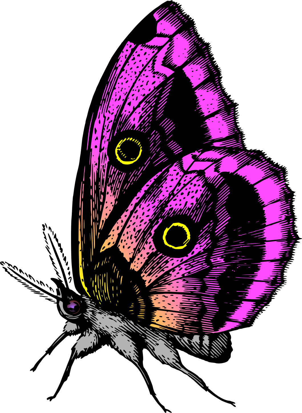This features a beautifully drawn illustration of a butterfly with pink and black wings. It has two yellow circles on its wings, adding to the visual appeal of the design. The butterfly is facing left, giving it an interesting perspective as it appears to be flying away from the viewer. Its wings are closed, creating a sense of stillness in the image. Overall, this illustration captures the elegance and grace of a butterfly with its vibrant colors and intricate details.
