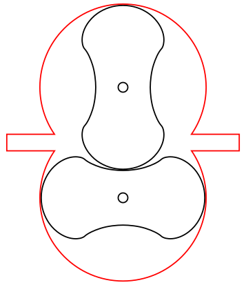 This features a drawing of an object that appears to be a part of a machine or device. It is described as a "supercharger" and has two parts with black outlines, one on the left side and another on the right side. Additionally, there are two circles in the middle of each part, which could possibly represent bolts or other components. The drawing itself is red, giving it a distinctive appearance.