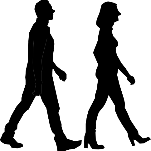 This features a man and woman walking side by side, each with their own distinct silhouette. The man is on the left side of the image, while the woman is positioned to his right. Both figures are wearing black clothing, which adds to the overall dark atmosphere of the scene. The man appears to be taller than the woman, as he extends further into the background. Their silhouettes create a sense of depth and dimension in the image, making it an interesting visual representation of two people walking together. The contrast between their figures and the white background adds emphasis to their presence within the scene.