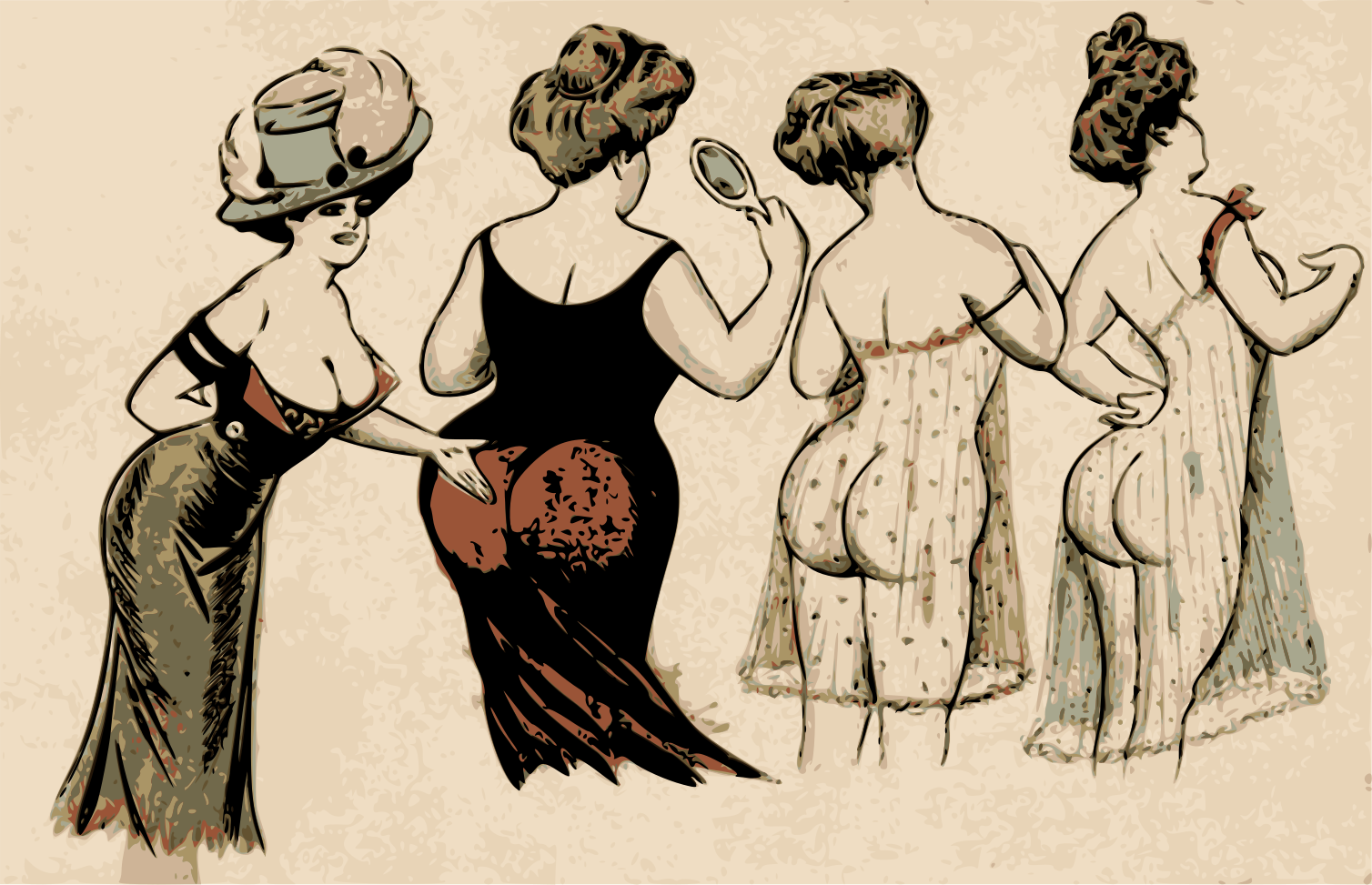 This features a group of women in various stages of undress, with one woman showing the large bums of the other ladies. They are all wearing lingerie and appear to be posing for a picture. There is a total of five women in the scene, each displaying different levels of nudity. The image has an old-fashioned feel to it, possibly reminiscent of postcards from a century ago.