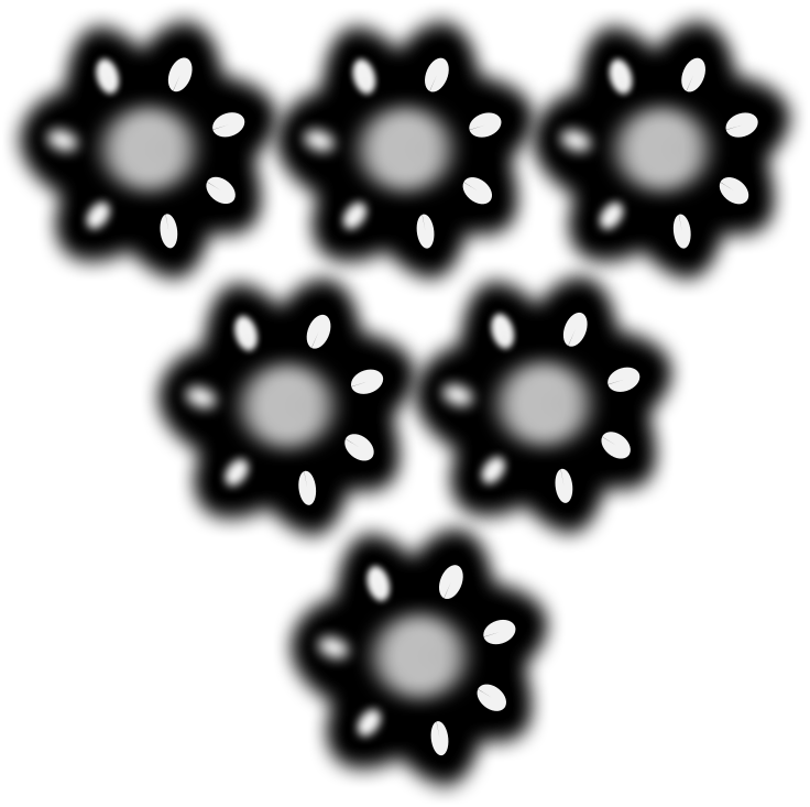 This features a group of six black and white knobs arranged in a circular pattern. Each knob is slightly overlapping the others, creating an interesting visual effect. The knobs are positioned at various angles, giving the impression that they are part of a larger structure or device. Overall, the image presents a unique composition with a focus on these six distinctive knobs.