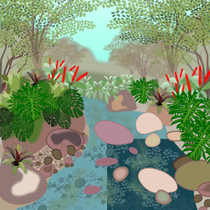 This depicts a serene forest landscape with a light blue stream in the middle of it. The stream is surrounded by rocks, creating a picturesque scene. On each side of the picture, there are green plants with red flowers, adding to the natural beauty of the environment. The overall atmosphere suggests a peaceful and tranquil setting, perfect for relaxation or contemplation.
