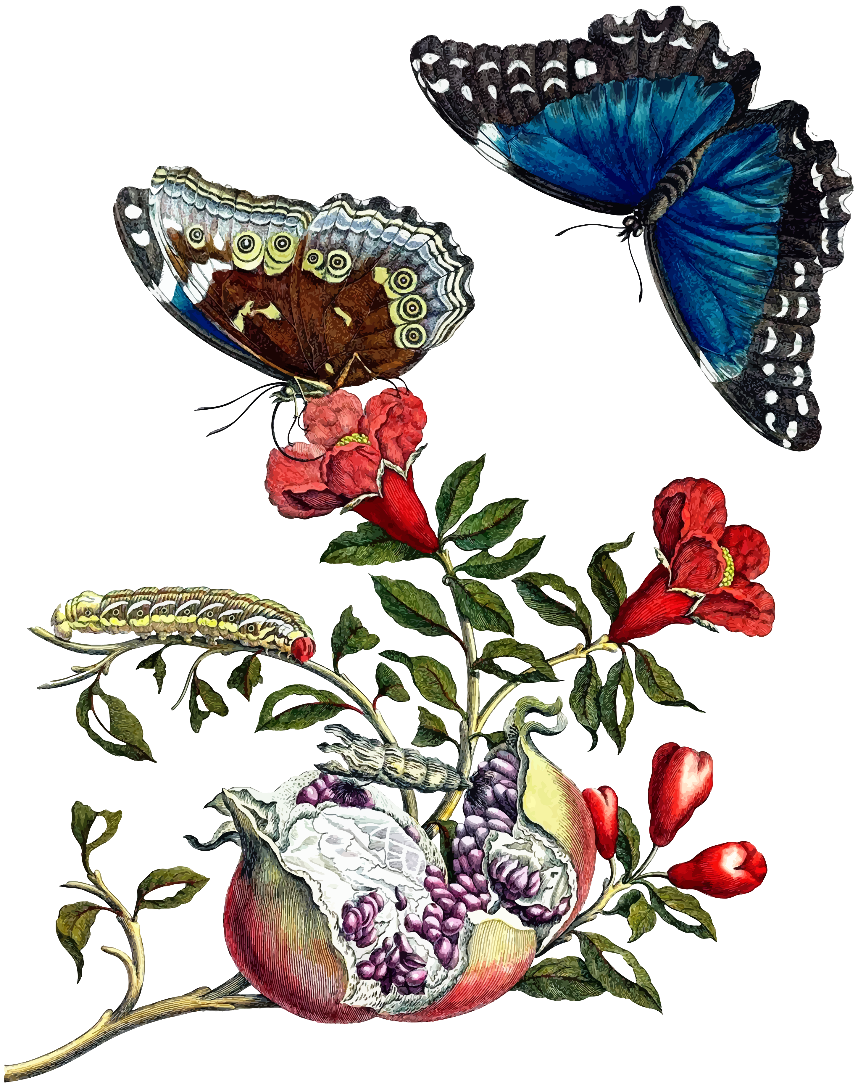 This features a beautiful illustration of two butterflies flying above a flowering pomegranate plant. One of the butterflies is bright blue and black, while the other one has a dark brown and off-white color. The butterfly on the left is positioned higher up in the scene, while the right butterfly is closer to the bottom. The flowering pomegranate plant is adorned with red flowers, creating an eye-catching contrast against the vibrant colors of the butterflies. The image captures a serene and peaceful moment in nature, where these delicate creatures gracefully soar above the lush foliage.