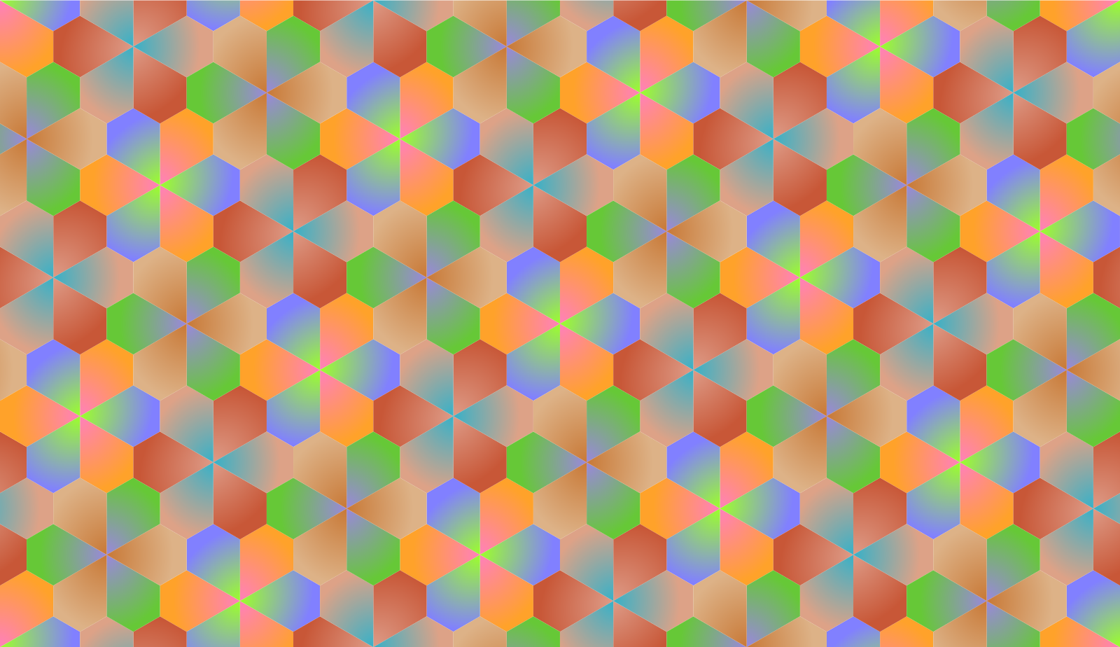 This features a colorful, geometric pattern with various shapes and colors. The background consists of a mix of reds, oranges, pinks, yellows, greens, blues, purples, and browns. These vibrant hues create an eye-catching and lively atmosphere in the scene. The pattern is composed of numerous hexagons, which are arranged in different orientations to form a visually appealing design. Overall, this image showcases a unique and captivating color palette that stands out from more traditional patterns.