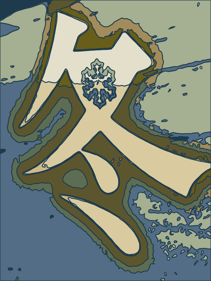 This features a unique and intricate design that resembles an old map or a topographical drawing. This artistic piece is composed of several interconnected lines, forming a complex pattern that appears to be inspired by kanji characters. The lines are arranged in such a way that they create a visually striking composition, with some sections appearing more prominent than others. Overall, the image exudes an air of creativity and artistry, showcasing the artist's skillful use of these interconnected lines to create a captivating visual experience.