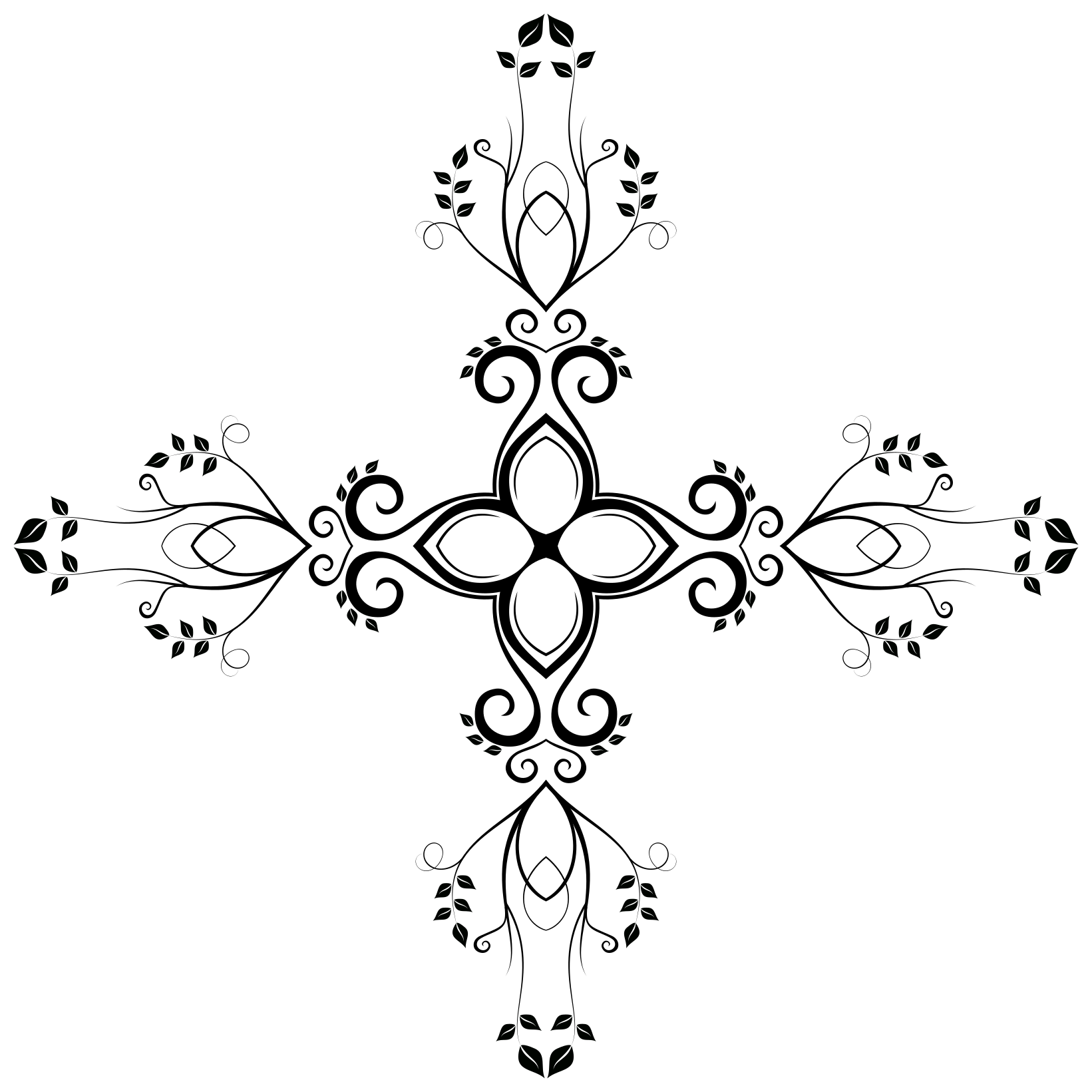 This features a cross design with four points, each point adorned with intricate floral patterns. The entire design is black and white in color, giving it an elegant appearance. The cross itself has a swirling pattern that adds to its visual appeal. This artistic piece can be used for various purposes such as decoration or even as a religious symbol.