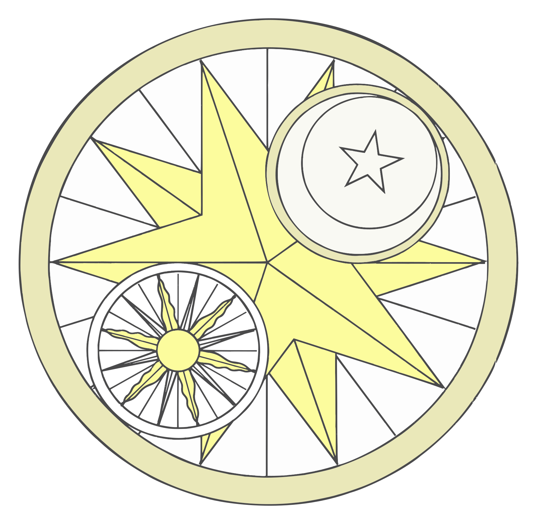 This features a round design with a yellow and white color scheme. In the center of the design, there is a yellow star surrounded by two circles. One circle is located above the star while the other one is below it. These circles are connected to the star through lines that create an interconnected pattern. Additionally, there is a moon in the background with a white outline and a sun in the foreground with a white circle. The overall design gives off a sense of balance and harmony between the elements.