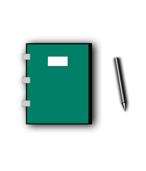 This features a green and white notebook sitting on top of a table. The notebook is open, revealing its pages for writing or taking notes. Beside the notebook, there is a pen placed upright, ready to be used by someone who wants to write in the book. This scene suggests that the person using this notebook might be engaged in some form of journaling or note-taking activity. The combination of the open notebook and the pen creates an inviting atmosphere for creative writing or organization.