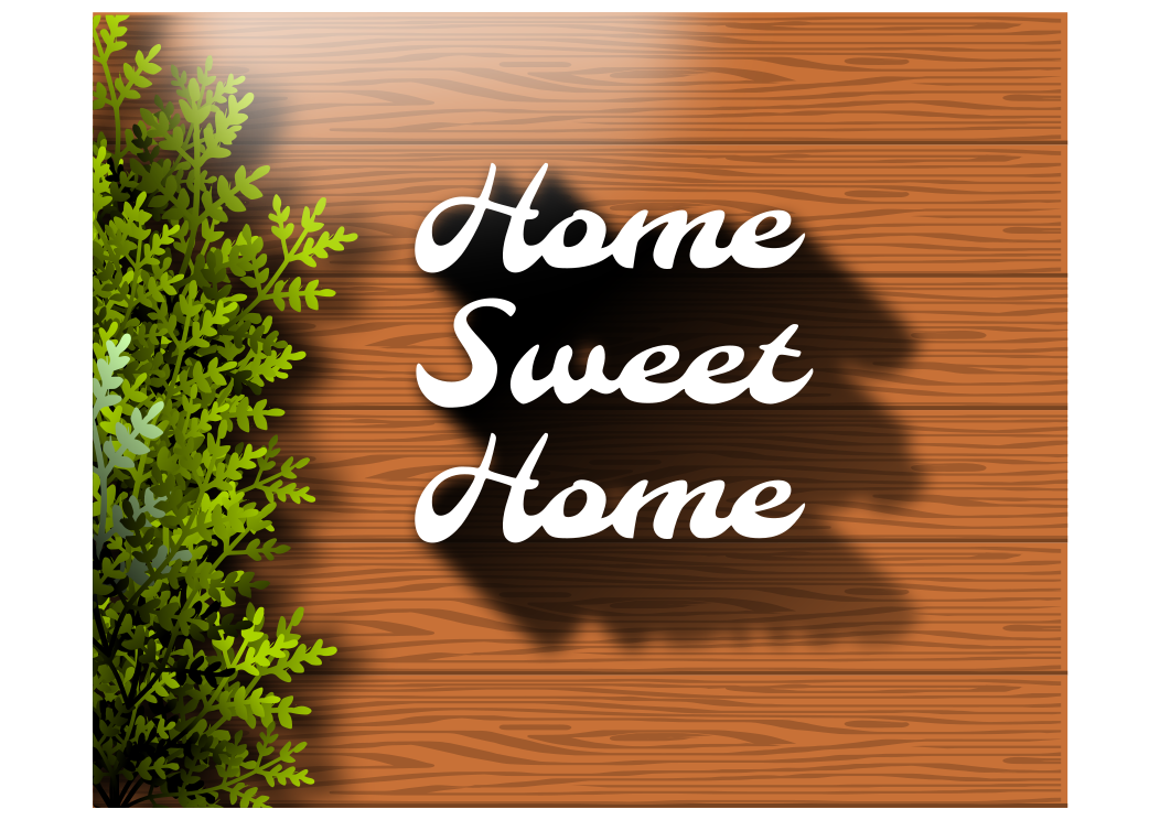 This features a wooden sign with the words "Home Sweet Home" written in an italic font. The letters are arranged in such a way that they cast a shadow on the wooden surface, giving it a unique and visually appealing appearance. The sign is adorned with leaves on its left side, adding to its charm and making it an attractive decoration for any home or space.