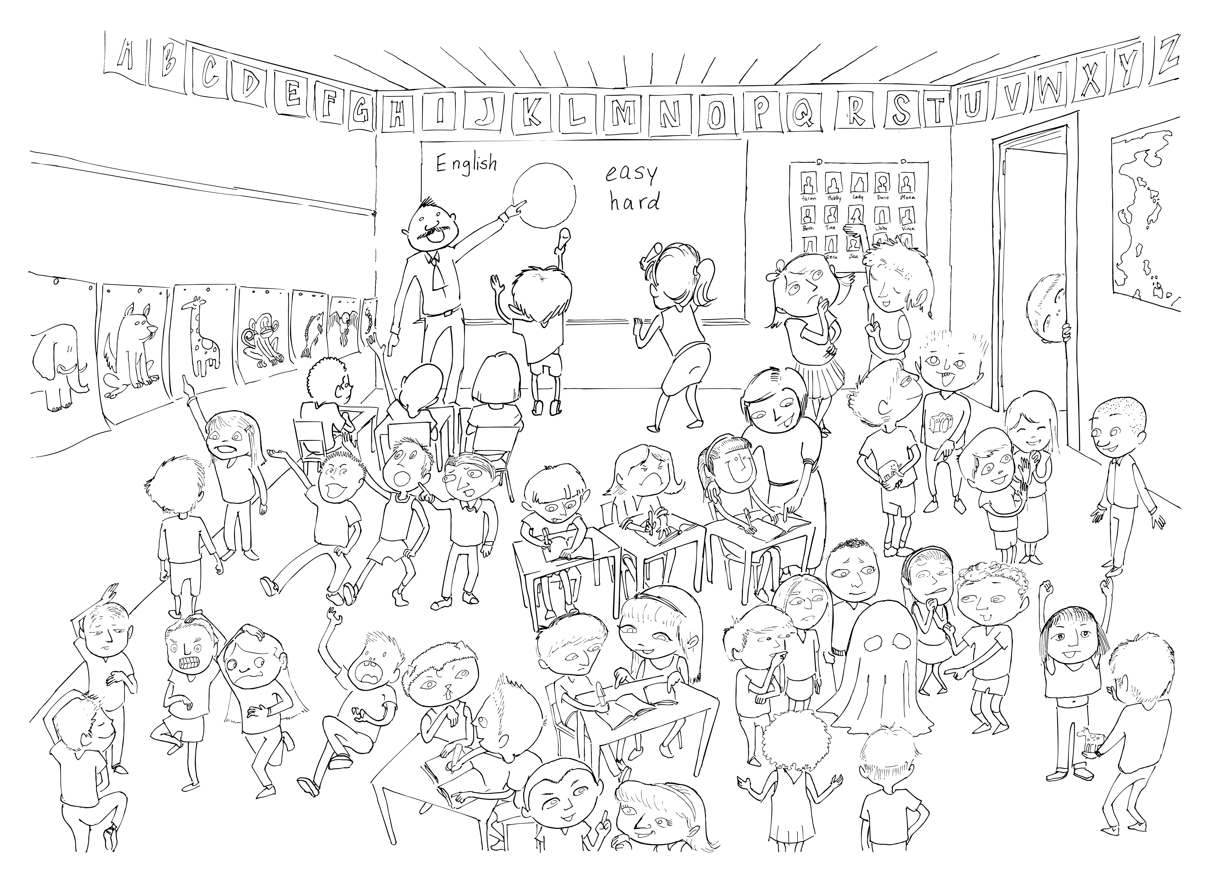 This is a black and white drawing of a classroom scene. In the center, there are several students gathered around a teacher who appears to be trying to teach them something. Among the students, some are engaged in various activities such as dancing or talking with each other. There are at least 14 people visible in the image, including both children and adults. The drawing captures the lively atmosphere of a classroom setting where learning is taking place.