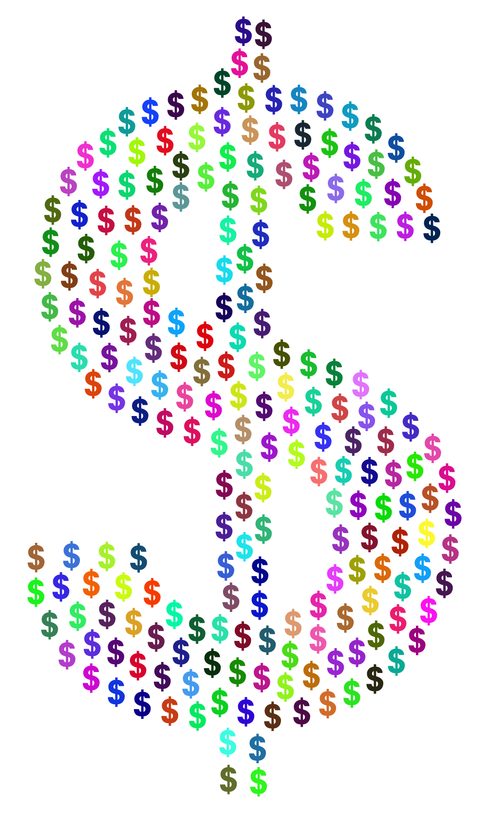 This features a large dollar sign made up of smaller, colorful dollar signs. These smaller dollar signs are arranged in various positions and colors to create the illusion of a single, larger dollar sign. The arrangement of these smaller dollar signs creates an interesting visual effect that draws attention to the main subject. This creative representation of money can be used for artistic purposes or as a unique way to convey financial concepts.