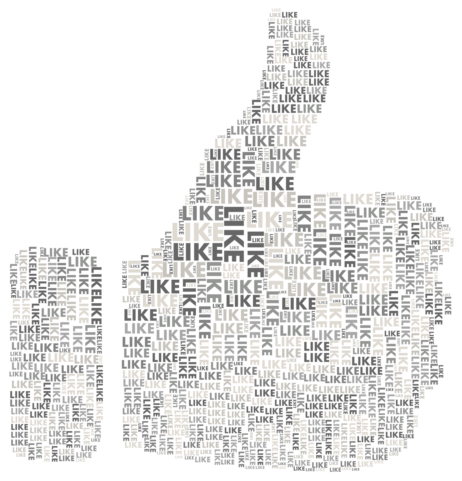 This features a large, close-up view of a thumbs up sign. This symbol is made up of many smaller instances of the word "like" arranged in various orientations and sizes. The word "like" appears numerous times throughout the scene, creating an interesting visual effect that emphasizes the theme of liking or approval. The overall composition of the image gives a sense of unity and strengthens the message conveyed by the thumbs up sign.