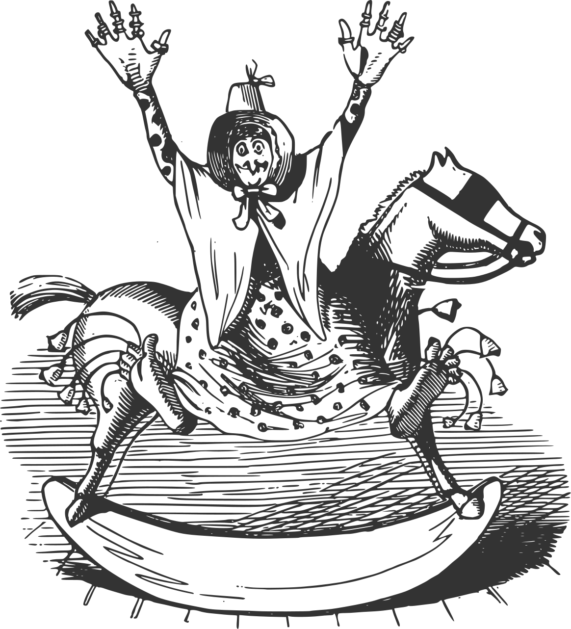 This features a woman riding on the back of a rocking horse, with her hands raised in the air. She appears to be enjoying herself and is smiling as she sits atop the horse. The scene is depicted in black and white, giving it an old-fashioned feel. The woman's position suggests that she might be participating in a carnival or fair game, adding excitement and fun to the image.