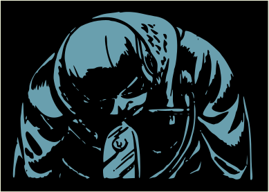 This features a man with his head down, wearing a helmet and holding a microphone. He appears to be looking at the ground or possibly listening intently to something. The man is dressed in black clothing, which adds to the overall dark atmosphere of the scene. The drawing itself has a blue tint, giving it an artistic and unique appearance.