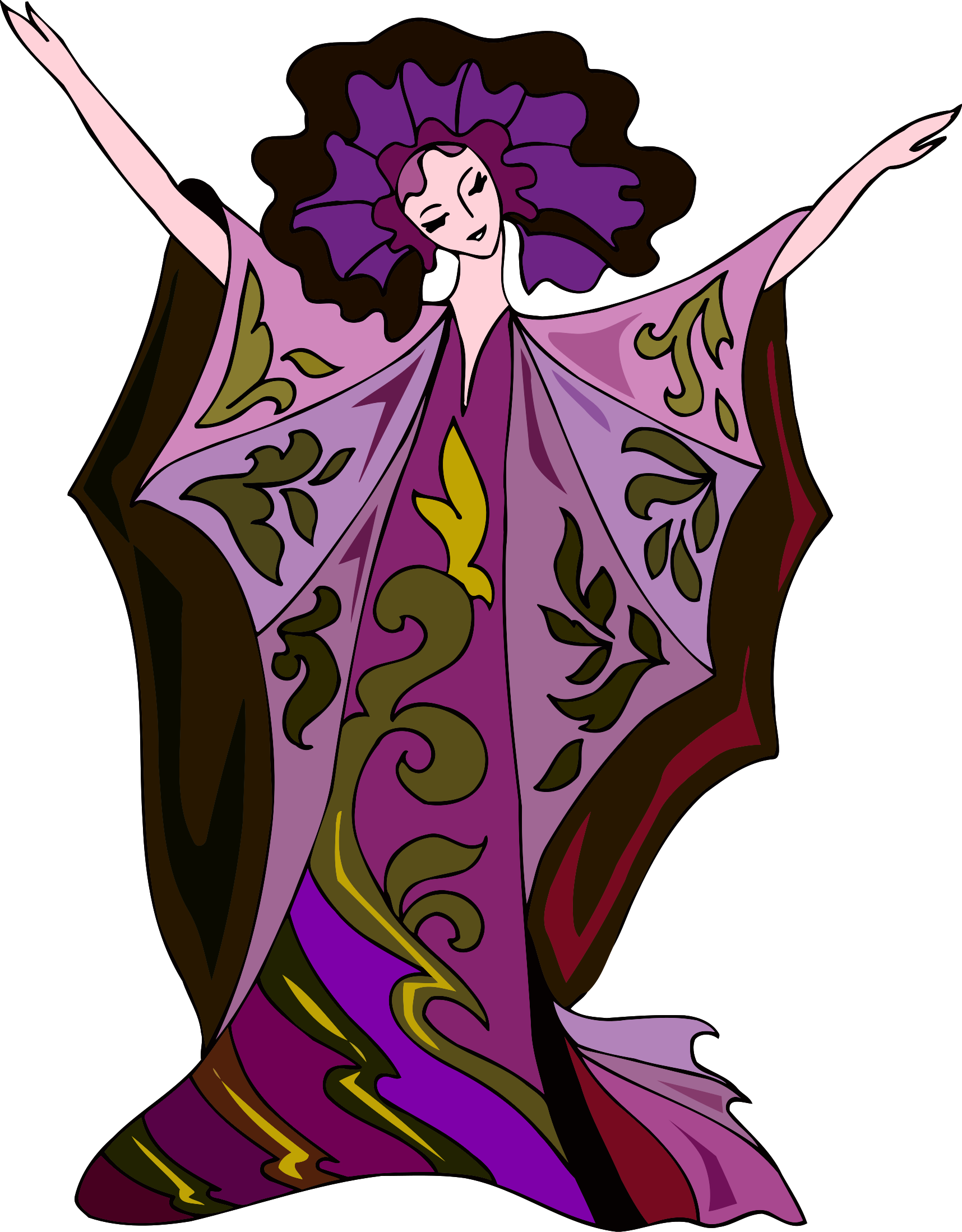 This features a woman dressed in a purple and brown flowing gown, with her arms raised above her head. She appears to be dancing or performing some kind of movement. The dress is adorned with intricate patterns and designs, adding an artistic touch to the scene. The woman's pose suggests that she might be expressing joy or celebrating a special occasion. Overall, the image captures a moment of beauty and grace in motion.