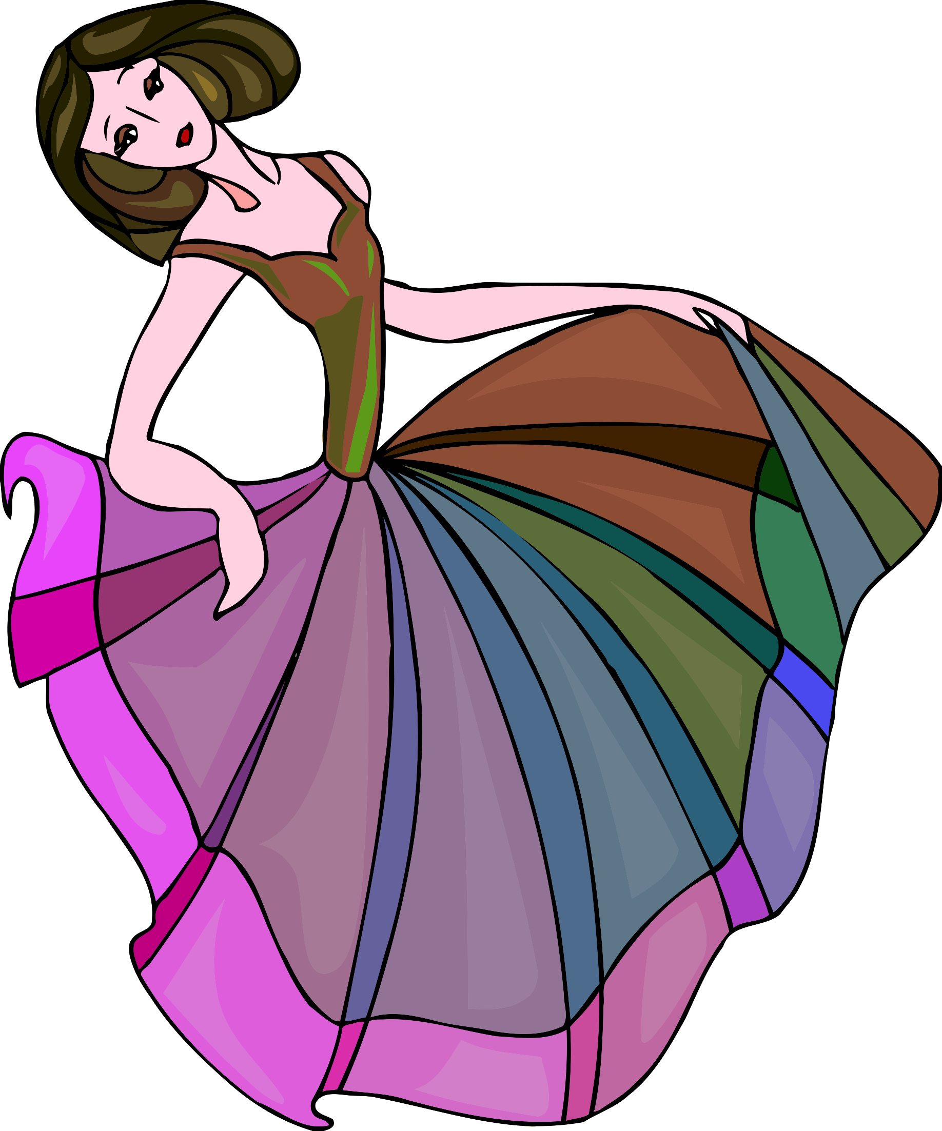 This features a woman in a colorful dress, possibly dancing or posing for the picture. She is wearing a brown and pink dress with a long skirt that adds to her elegant appearance. Her outfit appears to be inspired by a princess theme, as she stands confidently in front of the camera. The woman's posture suggests that she might be performing a dance or simply enjoying herself while posing for the picture.