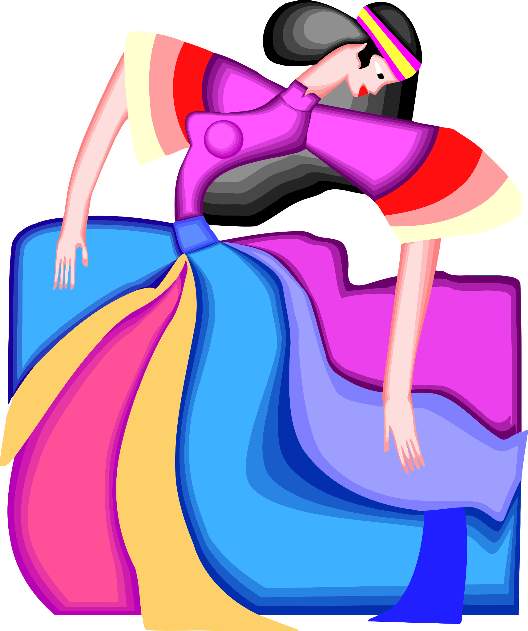 This features a colorful and vibrant drawing of a woman in a flowing dress, possibly dancing. She is wearing a blue dress with yellow accents, giving the scene a lively atmosphere. The woman's outfit appears to be a combination of different colors, adding visual interest to the picture. The overall composition of the image showcases the artistic talent and creativity behind this unique piece of artwork.