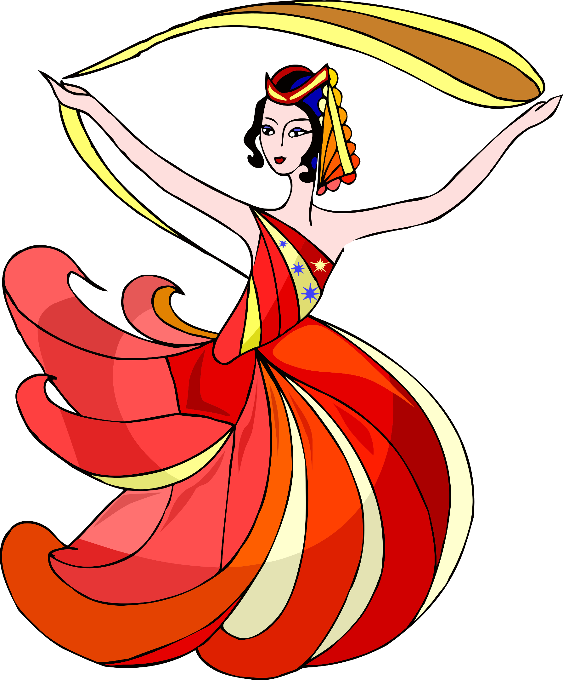 This features a woman dressed in a red and orange dress, with her arms outstretched as she dances. She is wearing a headband that adds to the vibrant color of her outfit. The woman appears to be enjoying herself as she performs this dance. The scene is set against a backdrop of a red and white striped pattern, which complements the colors of the dress. Overall, it's an energetic and lively image that captures the essence of dance and movement.