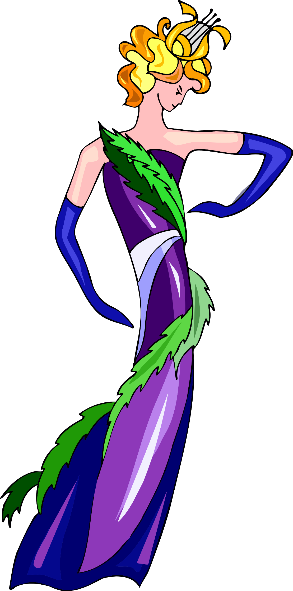 This features a woman dressed in a purple and green dress, standing with her hands on her hips. She is wearing blue gloves and has a green headpiece adorning her hair. The woman appears to be posing for the camera, showcasing her unique outfit. The overall scene exudes an artistic and creative vibe, as it seems to be part of a collection of dancer drawings or postage stamps.