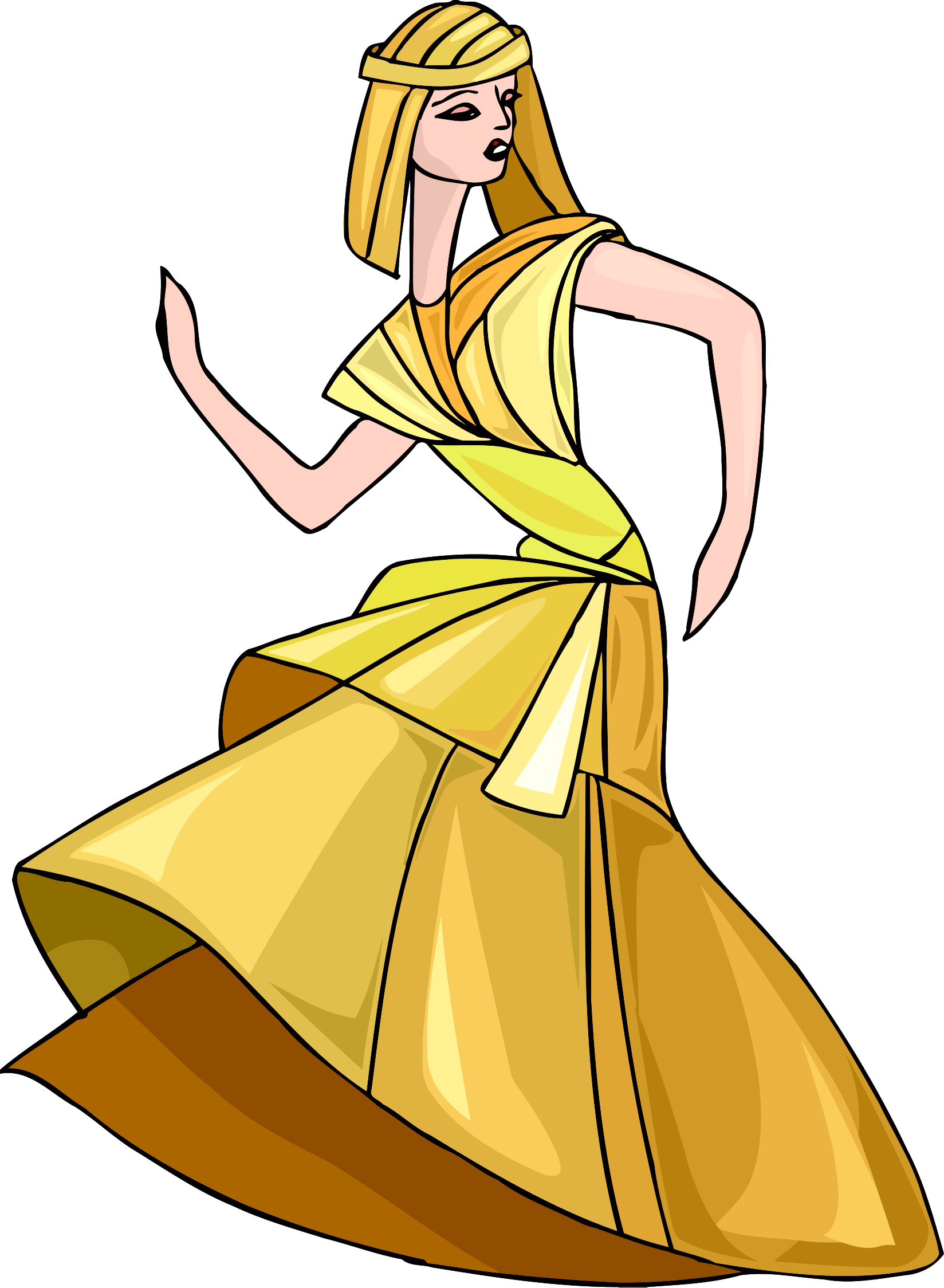This features a woman dressed in a yellow gown, standing on one leg and holding her hand up. She appears to be dancing or performing some kind of movement. The dress is long and flowing, with a gold color that complements the overall scene. The woman's posture suggests an artistic expression or performance, possibly as part of a dance routine.