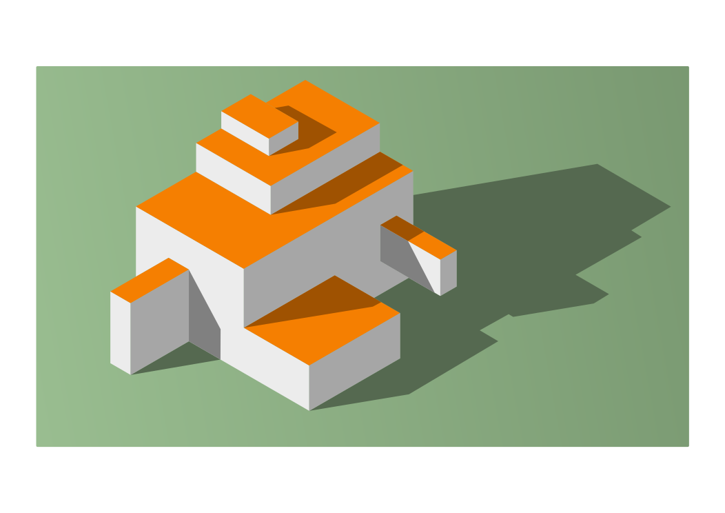 This features a three-dimensional, block-like structure with an orange roof. It is placed on a green background and appears to be made of Legos or similar building blocks. The structure has a unique shape, resembling a triangle or a stacked cube. A shadow can be seen cast by the structure, extending from its right side towards the bottom of the image. This adds depth and interest to the scene, making it an intriguing visual composition.