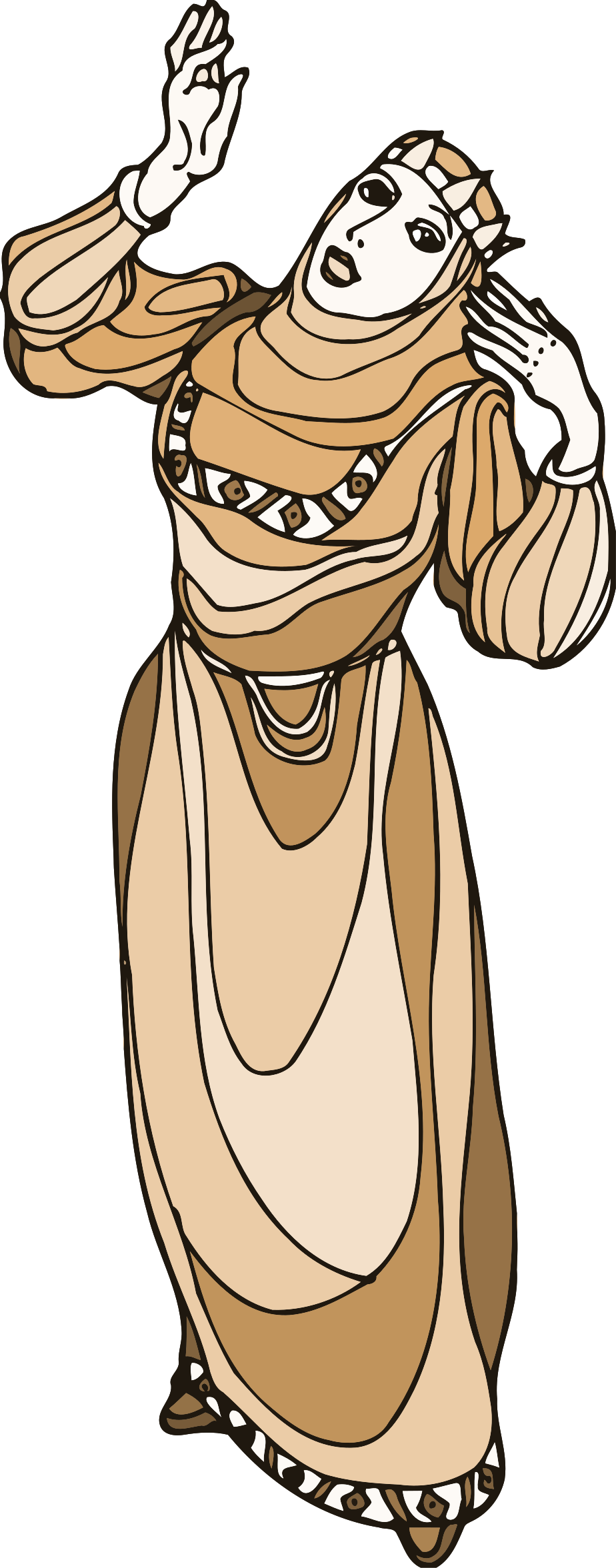 This features a woman dressed in a long brown dress, standing with her hands up. She appears to be wearing a crown and has a regal demeanor. The drawing is done in black and white, giving it an artistic and timeless quality. The woman's posture suggests that she might be performing or presenting something important. Overall, the image captures a sense of elegance and authority with its depiction of the woman dressed in royal attire.