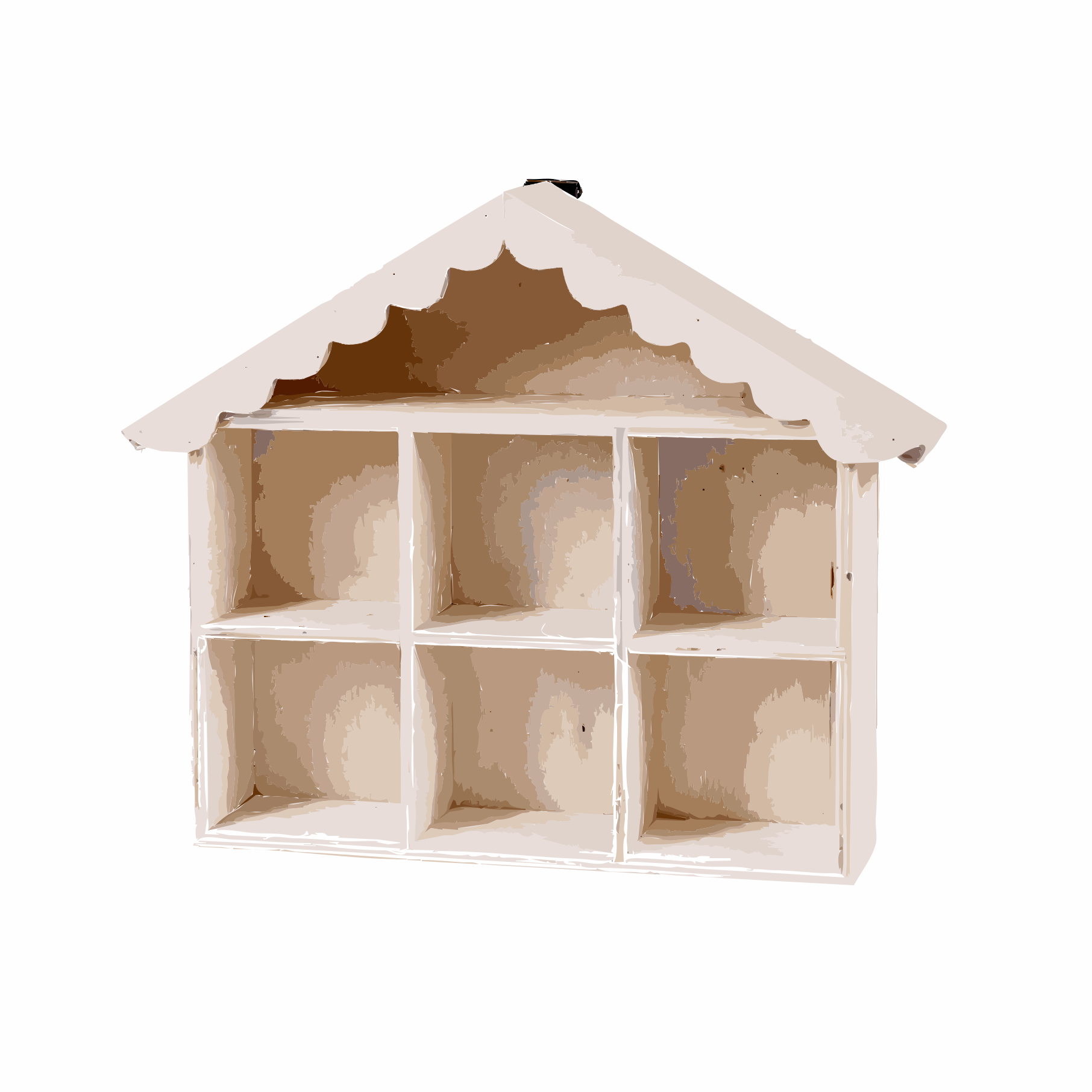 This features a white doll house with a scalloped roof, sitting on top of a table. Inside the doll house, there are several shelves filled with various items, creating an organized and cozy atmosphere. The shelves are neatly arranged, showcasing the interior design of the doll house. This charming scene is likely to evoke feelings of nostalgia for those who have played with doll houses in their childhood or simply appreciate the intricate details of this miniature home.