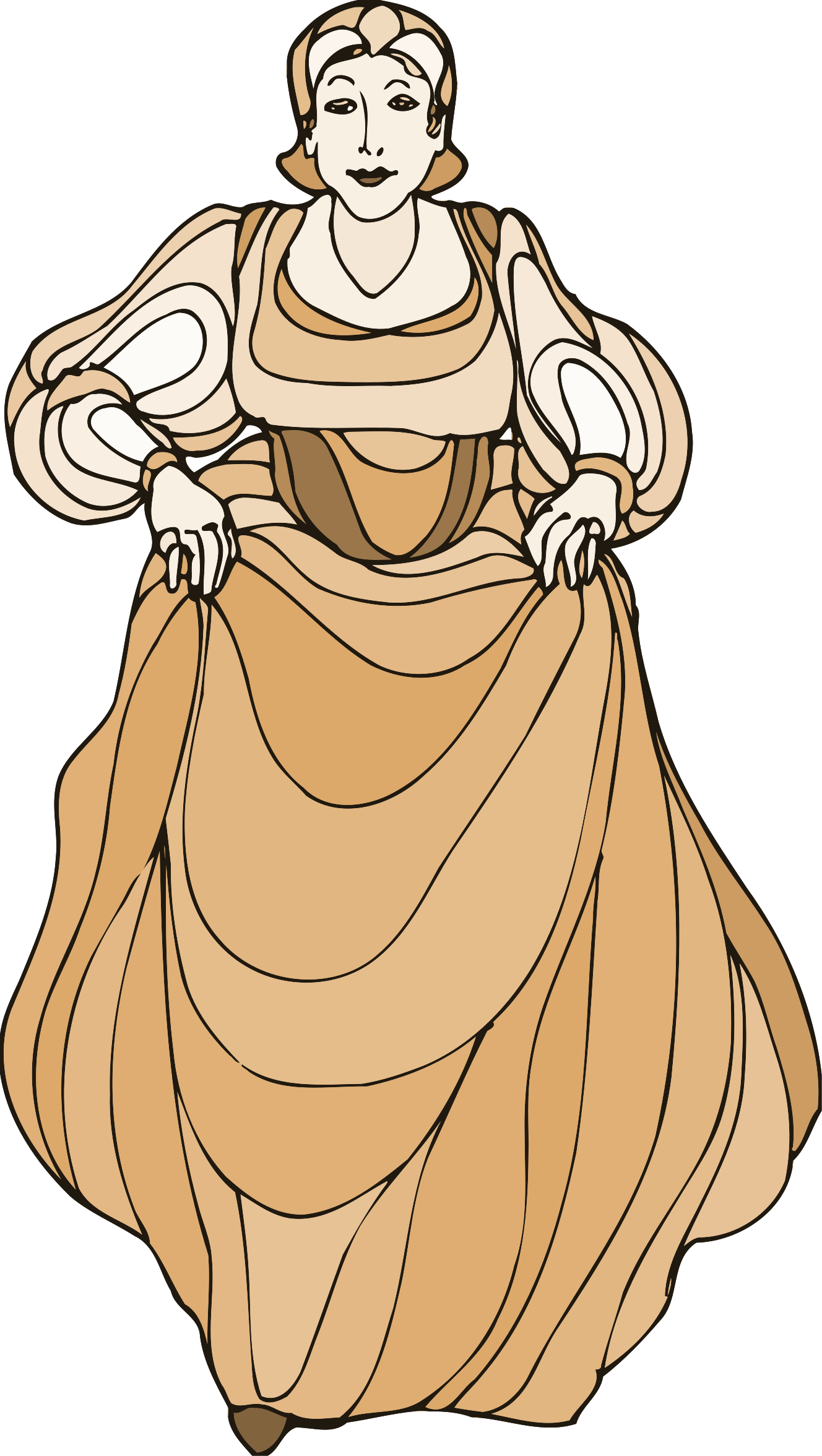 This features a woman dressed in a long, flowing dress. She is wearing a brown gown and appears to be walking or dancing with her hands on her hips. Her outfit gives off an elegant and graceful vibe. The woman's posture suggests that she might be performing a dance or simply enjoying the moment. The overall scene has a sense of motion, as if the woman is in action.