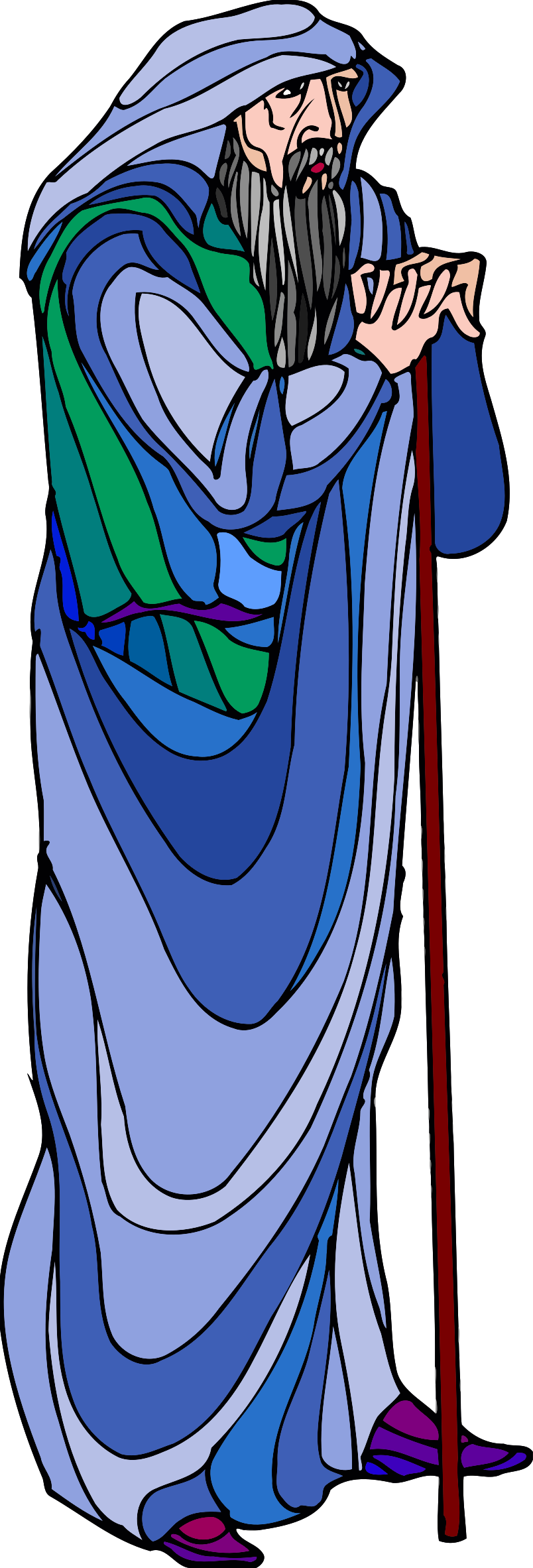 This features a colorful drawing of an old man with a long beard, wearing a blue robe and holding a red cane. He appears to be standing in front of a wall or a doorway, possibly looking into the distance. The man's attire suggests that he might be a wizard or a wise sage. The drawing is quite detailed, with intricate patterns on the man's robe and the red cane. Overall, it creates an impression of a powerful and knowledgeable individual.