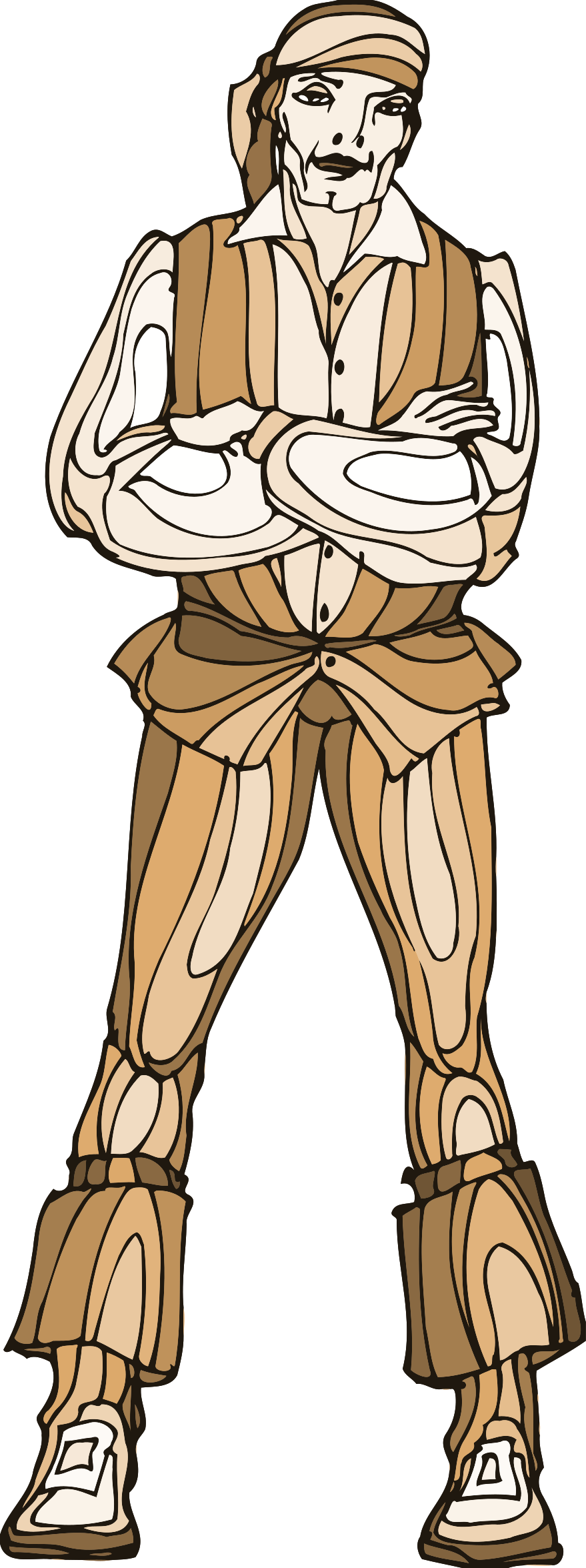 This features a man dressed in old-fashioned clothing, standing with his arms crossed. He is wearing a pirate costume and has a beard. The man appears to be the main focus of the scene, taking up most of the frame. In addition to the man, there are two other figures visible in the background, but they are smaller and less prominent than the main subject. Overall, the image captures an interesting moment with the pirate-like figure as its centerpiece.