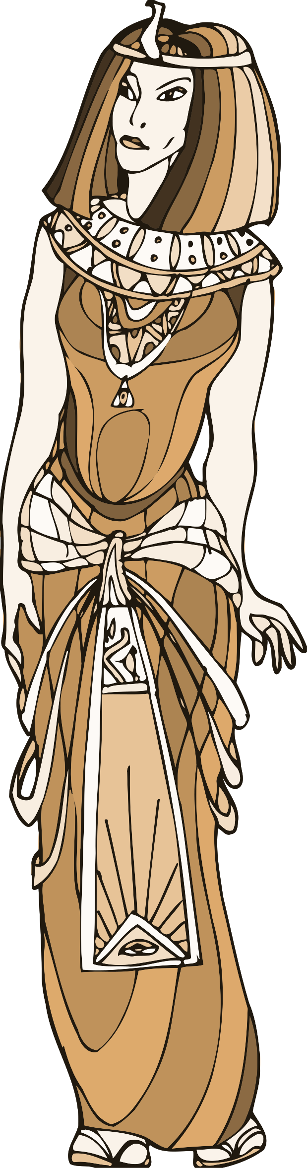 This features a woman dressed in an Egyptian costume, standing with her hands on her hips. She is wearing a gold necklace and has a crown on her head, giving the impression of being a queen or a goddess. Her outfit consists of a brown dress that extends down to her feet, adding to the regal appearance. The woman appears to be posing for a picture, capturing the essence of ancient Egyptian culture in this artistic representation.