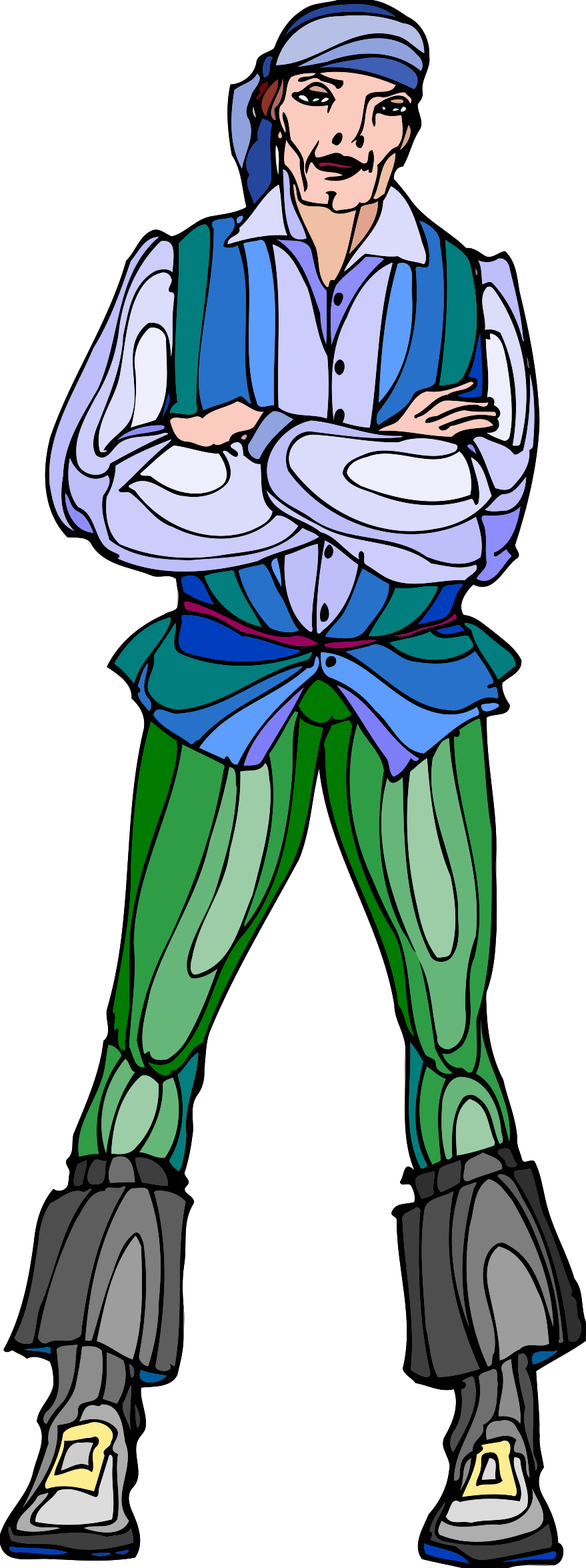 This features a colorful cartoon character dressed in green and blue clothing. This person appears to be standing with their arms crossed, giving off an air of confidence or authority. The character is wearing a pirate hat, which adds to the overall theme of the scene. The colors used in this illustration are vibrant and eye-catching, making it an engaging piece of artwork.