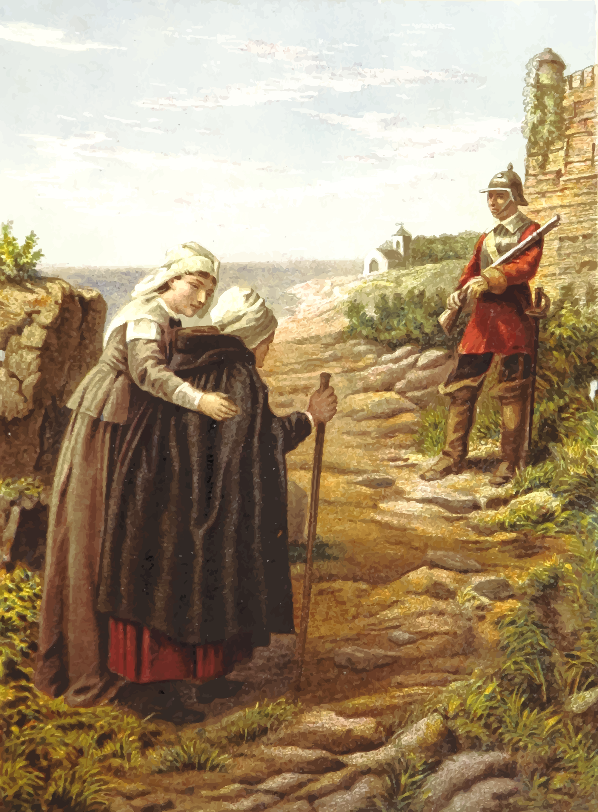 This depicts a scene of three people standing on a dirt road. A woman is bending over to help another person, who appears to be an older lady. They are both dressed in long black dresses, with the woman wearing a hat. In the background, there is a man holding a gun, possibly as a guard or for protection. The scene seems to represent duty and care for one another, as the woman assists the older lady.