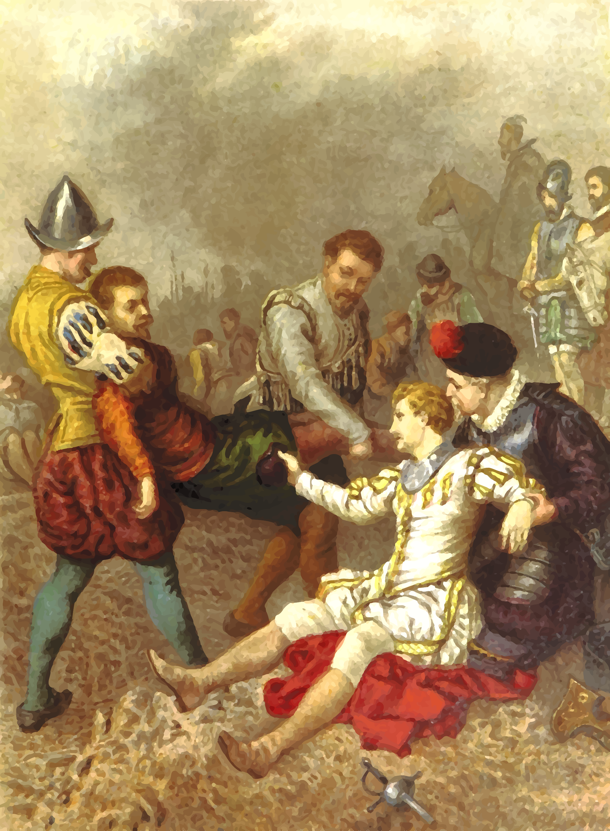 This depicts a group of men in medieval clothing gathered around a man lying on the ground. Some of these men are dressed as knights, while others appear to be soldiers or peasants. One of the men is holding a cup, possibly offering water to the sick individual. The scene seems to represent a moment of selflessness and care for another person in need. The image also features several horses scattered throughout the scene, indicating that this gathering might have taken place during a time when horses were commonly used as transportation or warfare. Additionally, there are two swords visible in the picture, suggesting that these men may be engaged in some form of combat or training exercise. Overall, the image captures a moment of human connection and compassion amidst historical context.
