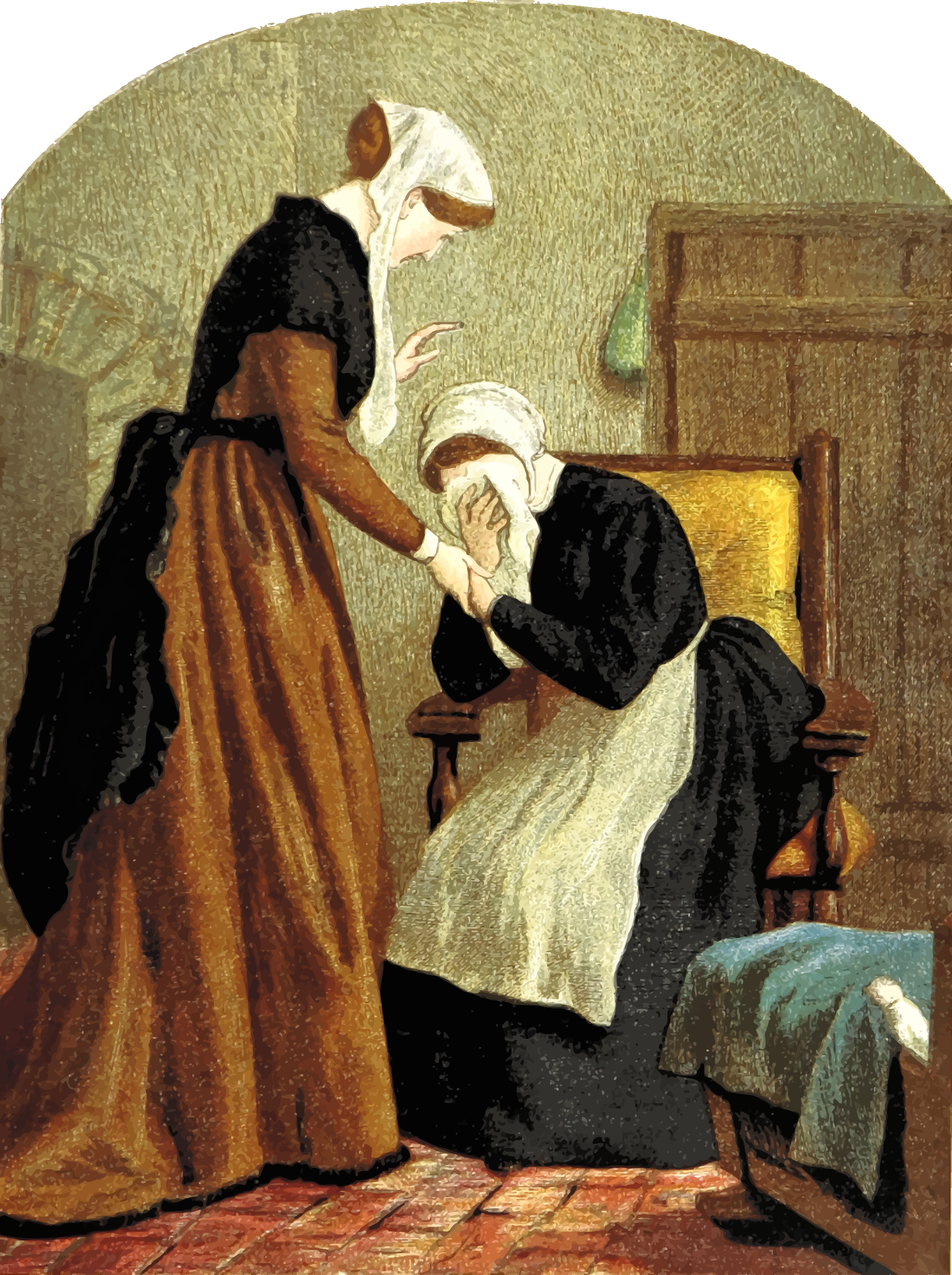 This depicts a scene from the 19th century, featuring two women dressed in old-fashioned clothing. One woman is kneeling down next to another woman who appears to be sitting on a chair or bed. They are both wearing white aprons, which suggests that they might be nursing someone or attending to their needs. The room has an antique feel with a vintage atmosphere, and the women seem to be engaged in a caring interaction.