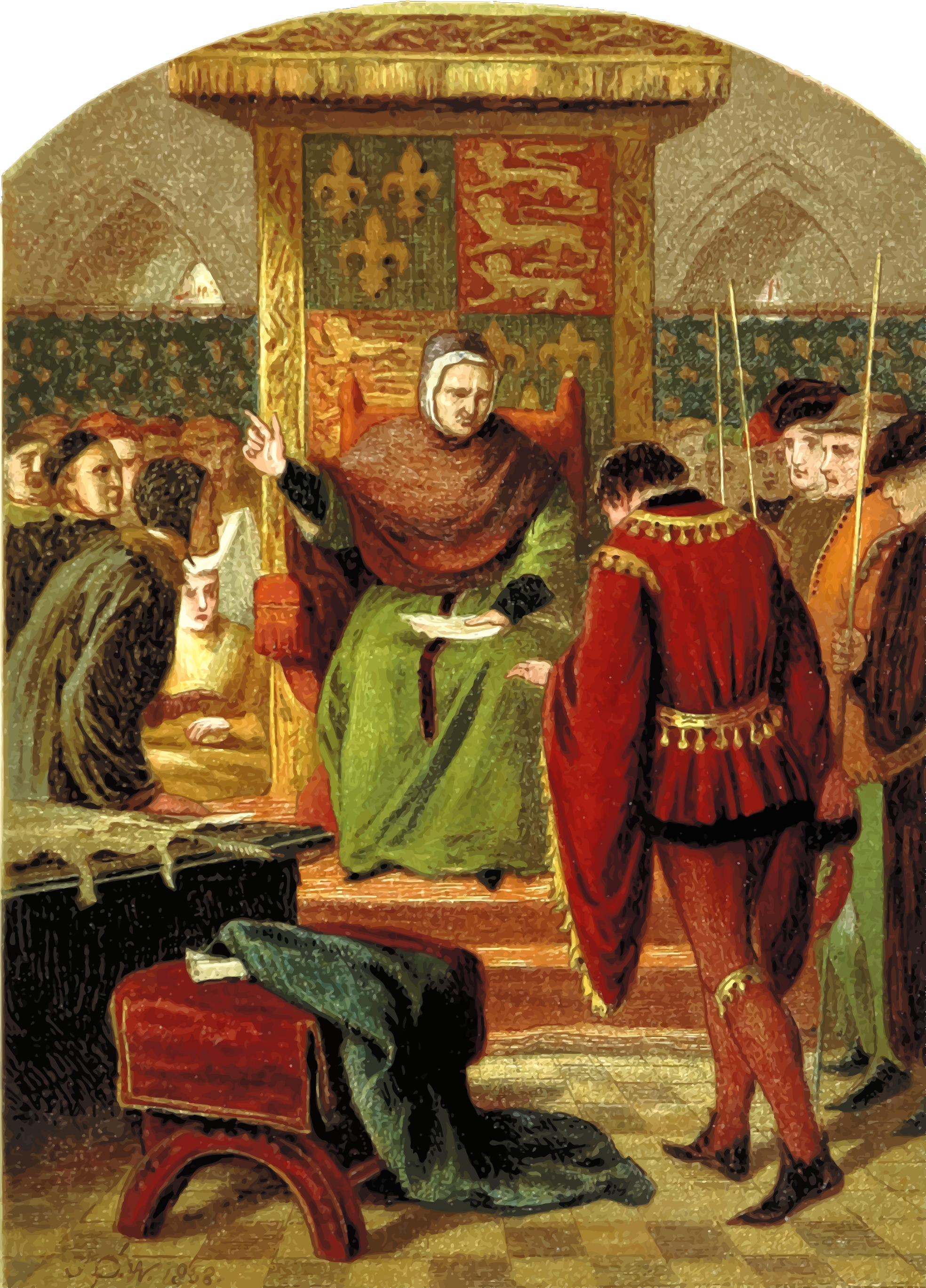 This depicts a scene from the 19th century book "The Nobility of Life, its graces and virtues, portrayed in prose and verse by the best writers." In this particular illustration, a woman is sitting on a chair while several men surround her. One man appears to be kneeling before her, possibly seeking justice or an audience with her. The scene captures the essence of human characteristics such as justice and respect for authority. The artist has skillfully portrayed the characters in this illustration, creating a sense of depth and intrigue within the image.
