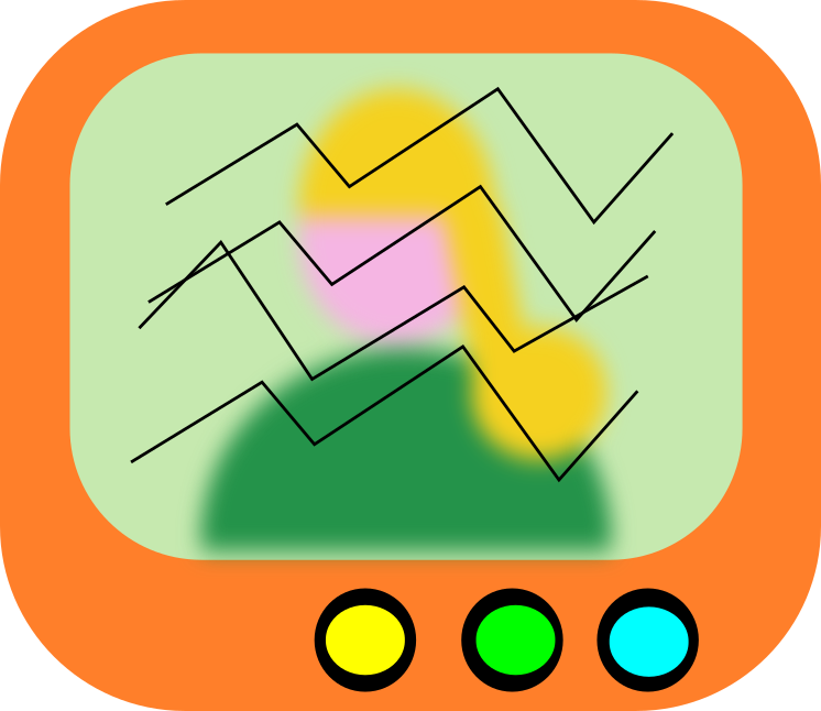 This features a television screen with an unusual and abstract design. The screen is filled with various lines, shapes, and colors that create a visually intriguing pattern. There are four buttons on the bottom of the screen, each one featuring different colors: yellow, blue, green, and orange. These buttons seem to be part of the television's interface or control system, allowing users to interact with the device in some way. The overall appearance of the screen is unique and captivating, making it stand out from typical television screens.